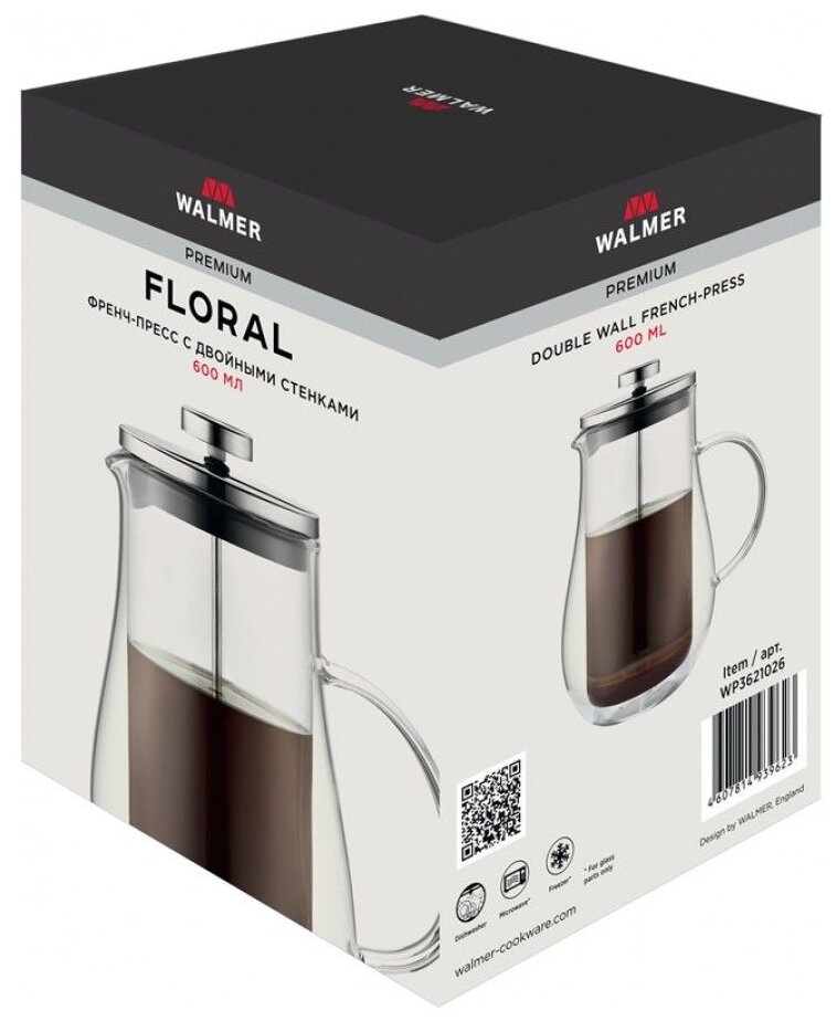 френч-пресс WALMER Floral 600мл двойная стенка термостекло стекло нерж. сталь пластик Френч-пресс с двойными стенками Floral 600 мл