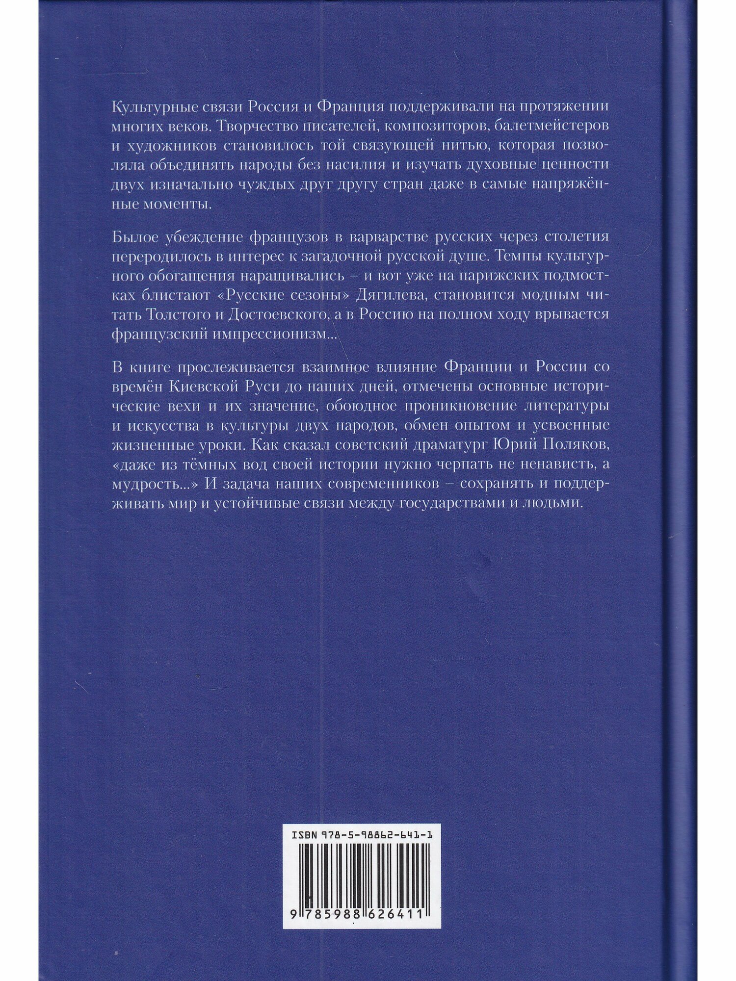 Книга о сложном процессе формирования на протяжении четырёх столетий отношений между Россией и Францией ещё раз подтверждает тезис о том, что именно культура вне зависимости от обстоятельств политического или экономического характера становится основой поддержания устойчивых связей между государствами и людьми.