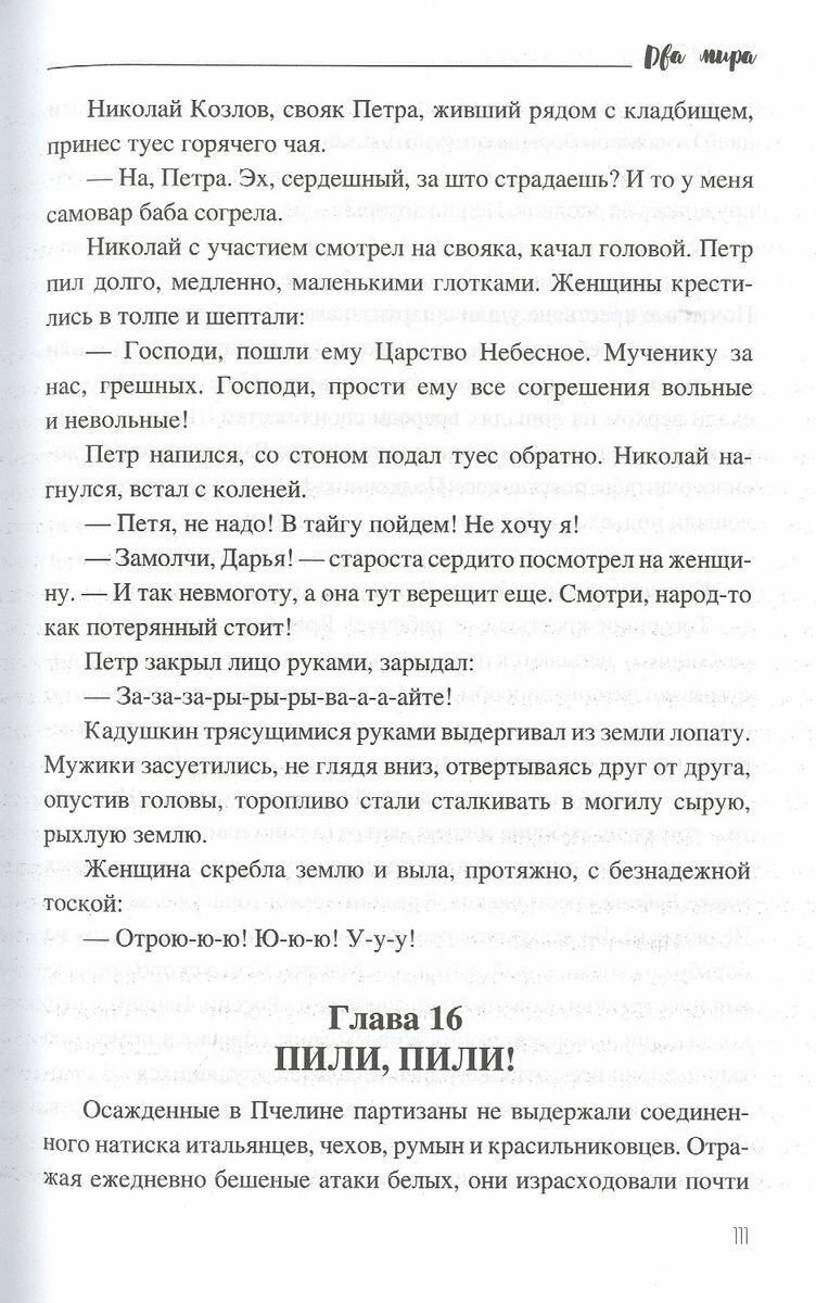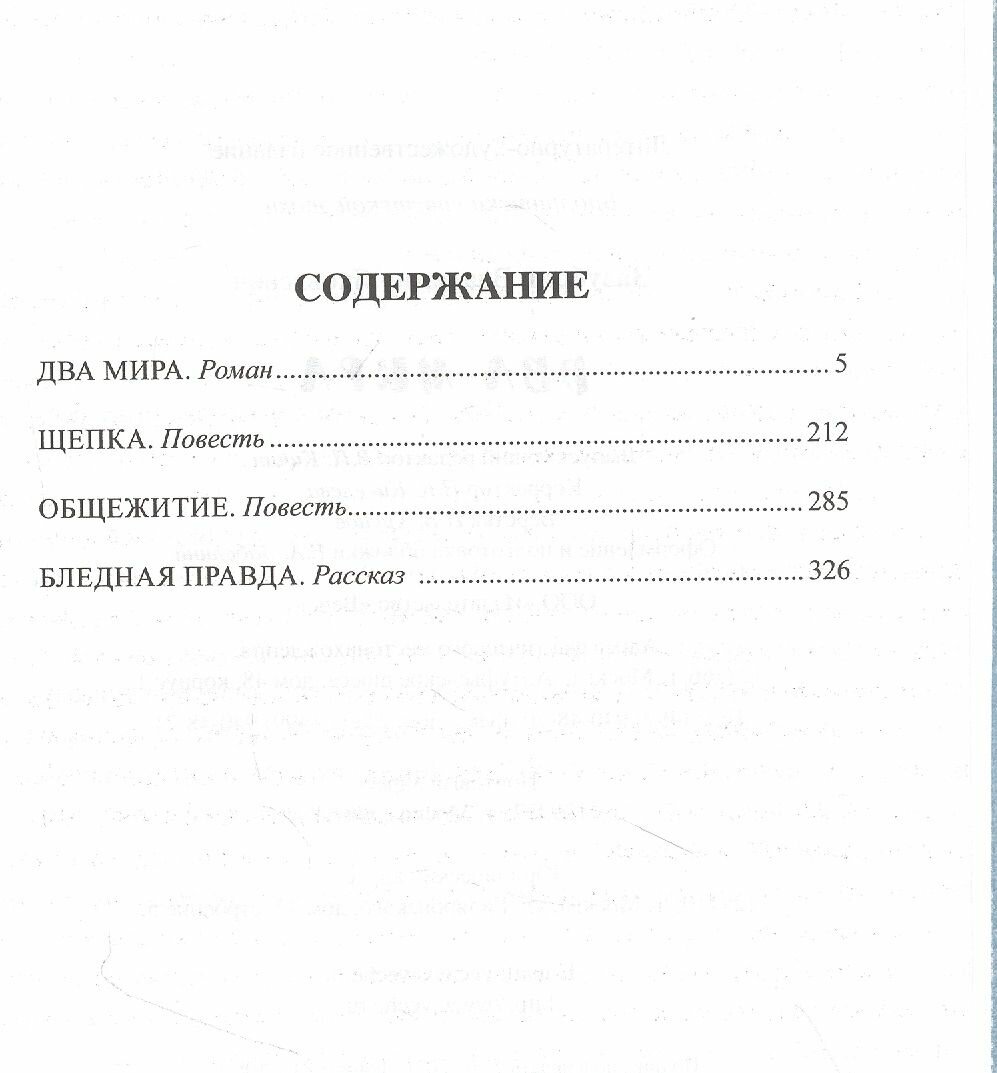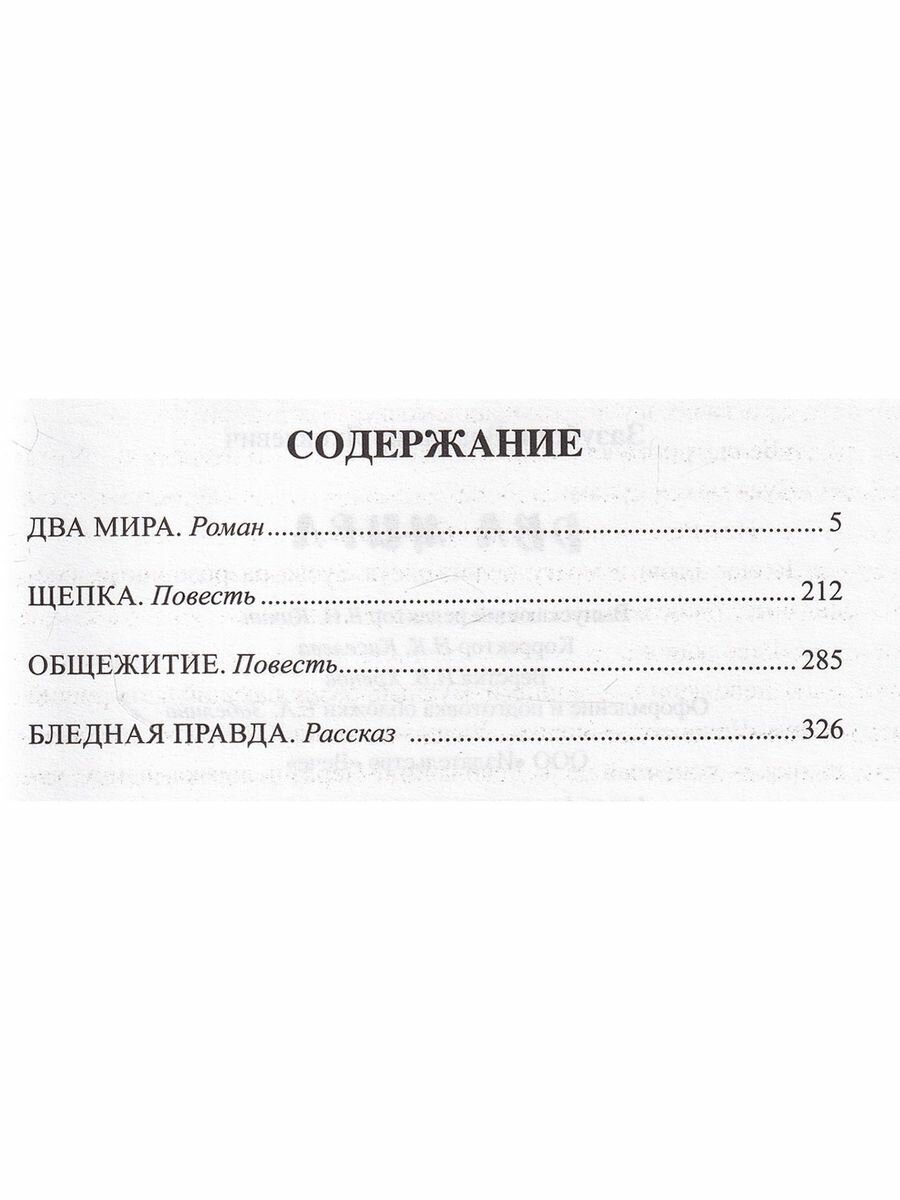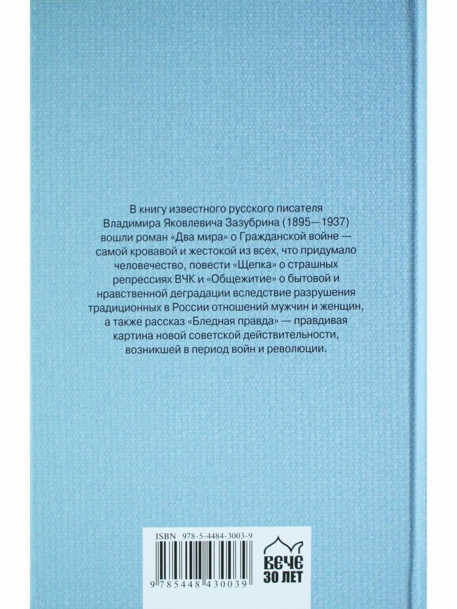 В книгу известного русского писателя Владимира Яковлевича Зазубрина (1895-1937) вошли роман "Два мира" о Гражданской войне - самой кровавой и жестокой из всех, что придумало человечество, повести "Щепка" о страшных репрессиях ВЧК и "Общежитие" о бытовой и нравственной деградации вследствие разрушения традиционных в России отношений мужчин и женщин, а также рассказ "Бледная правда" - правдивая картина новой советской действительности, возникшей в период войн и революции.