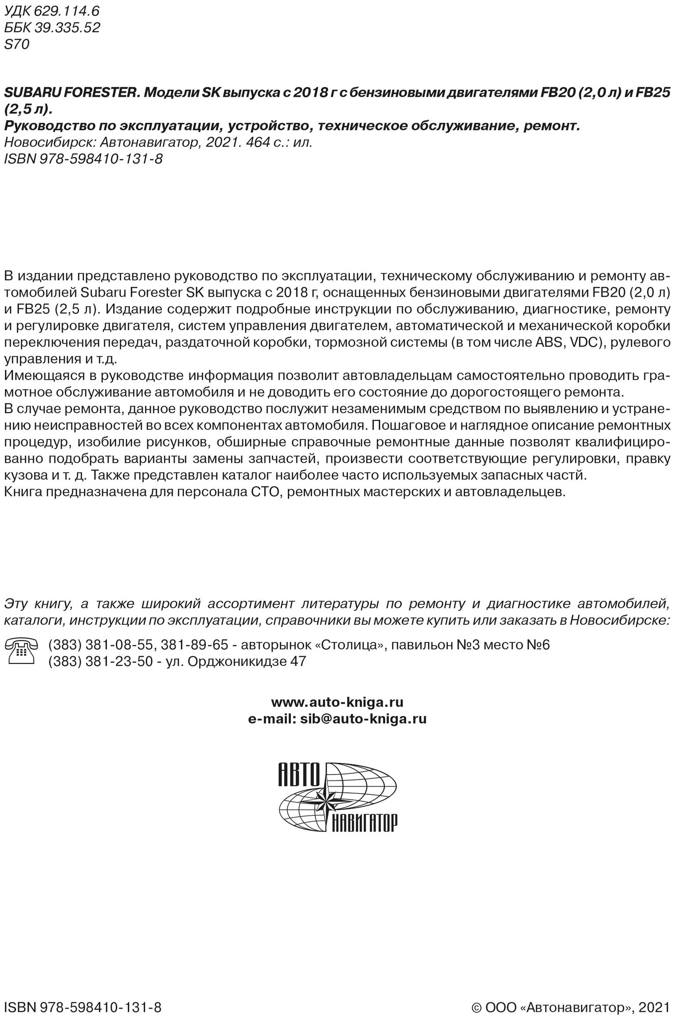 В издании представлено руководство по эксплуатации, техническому обслуживанию и ремонту автомобилей Subaru Forester SK выпуска с 2018 г, оснащенных бензиновыми двигателями FB20 (2,0 л) и FB25 (2,5 л). Издание содержит подробные инструкции по обслуживанию, диагностике, ремонту и регулировке двигателя, систем управления двигателем, автоматической и механической коробки переключения передач, раздаточной коробки, тормозной системы (в том числе ABS, VDC), рулевого управления и т.д.