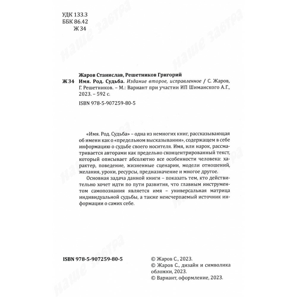 «Имя. Род. Судьба» – одна из немногих книг, рассказывающая об имени как о «предельном высказывании», содержащем в себе инфор-мацию о судьбе своего носителя. Имя, или нарок, рассматривается авторами как предельно сконцентрированный текст, который описывает абсолютно все особенности человека: характер, поведение, жизненные сценарии, модели отношений, желания, уроки, ресурсы, предназначение и многое другое.