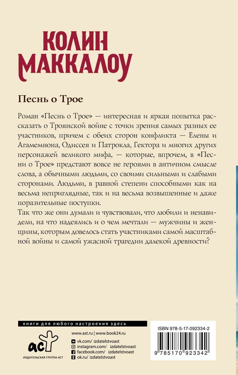 Колин Маккалоу – австралийская писательница 20-21 века с самым известным романом «Поющие в терновнике». Тем не менее, книга «Песнь о Трое» также достойна внимания читателей. Обложка выполнена в твердом и практически полностью матовом переплете, кроме небольшой лакированной вставки на внешней стороне. Страницы белоснежного цвета, шрифт четкий и удобный для чтения. Формат экземпляра стандартный с желтой ленточкой-закладкой.