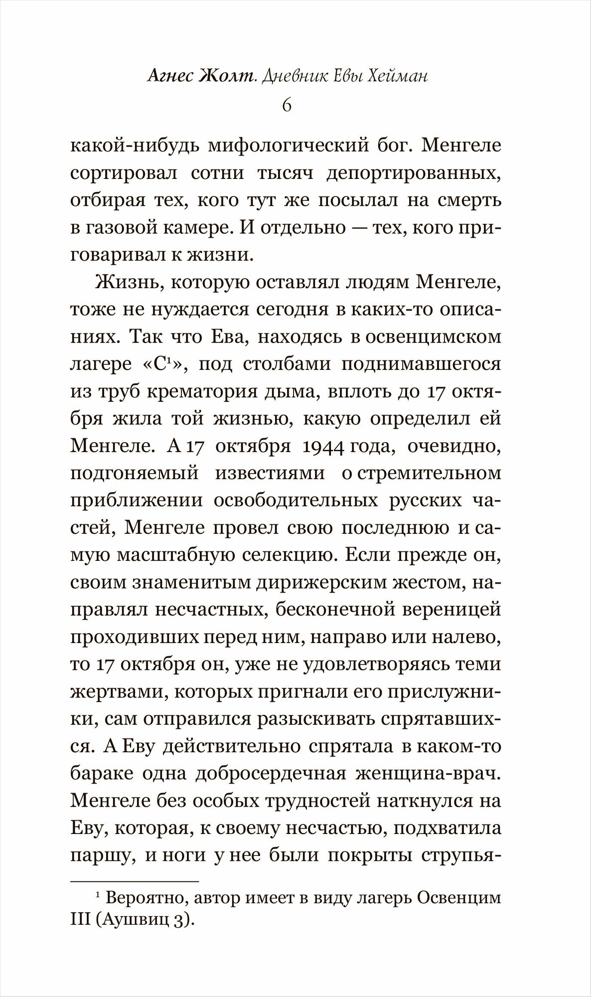 Жизнь Евы оборвалась 17 октября 1944 года. 6 июня, в тот самый день, когда союзные войска впервые ступили на землю Европы, высадив десант в Нормандии, Ева прибыла в Освенцим. Как многие миллионы других несчастных, она прошла через все ужасы концлагеря. По рассказам выживших свидетелей, она, несмотря на физические и душевные страдания, ни на мгновение не теряла воли к жизни, – этим объясняется, что ее физическое состояние, по сравнению с состоянием окружающих, оставалось, можно сказать, удовлетворительным. Двоюродная ее сестра и подруга, Марица Кечкемети, которую Ева не раз упоминает и в своем дневнике, умерла (также по свидетельству выживших) буквально у нее на руках, но воля к жизни и после этого не покинула Еву. Она делала все, на что способен человек в тринадцатилетнем возрасте, чтобы уцелеть и дождаться прихода того времени, о котором мечтали в аду фашизма окружающие ее люди. То есть эта тринадцатилетняя девочка, почти ребенок, боролась за свою жизнь так, что довольно долго противостояла потерявшим человеческий облик палачам Третьего Рейха