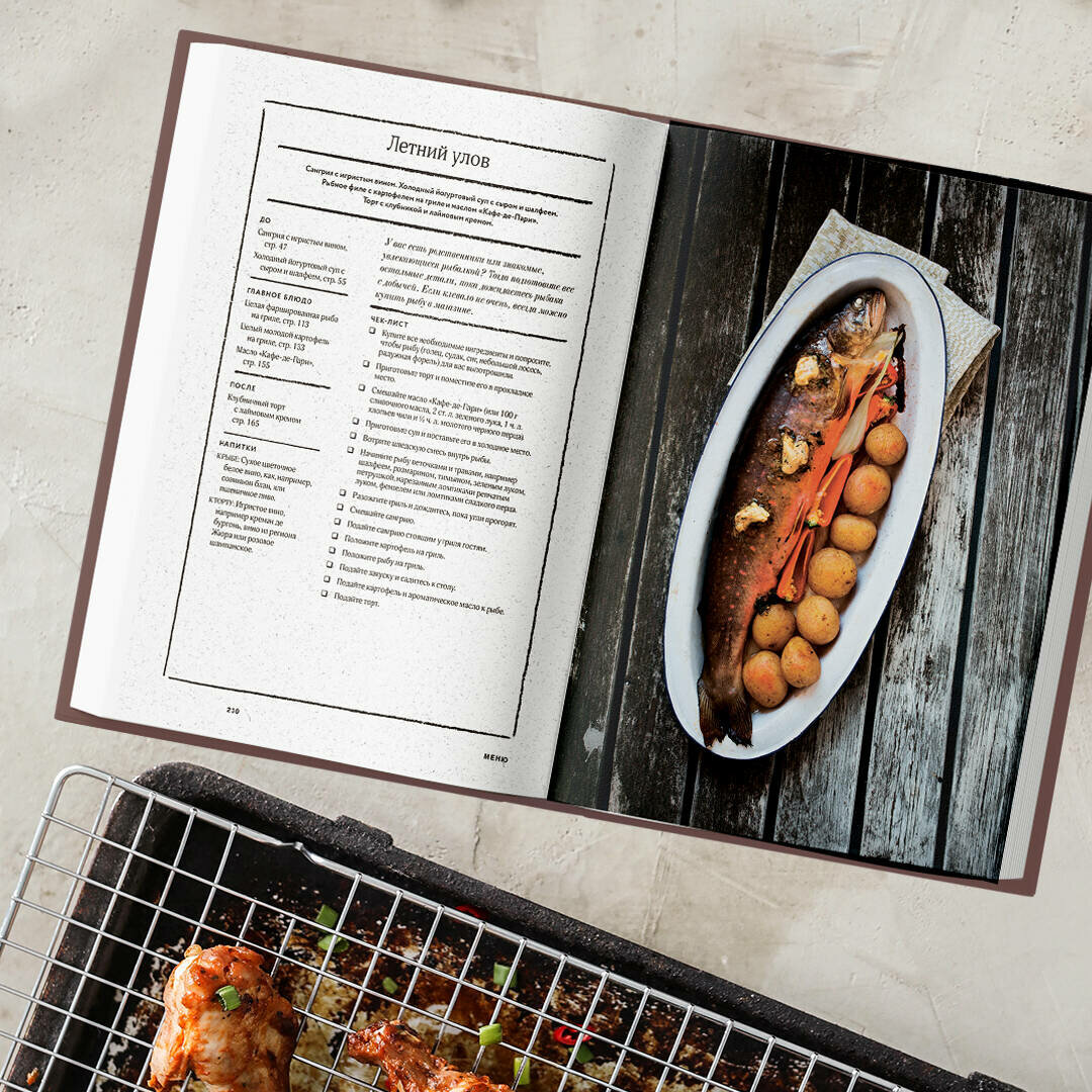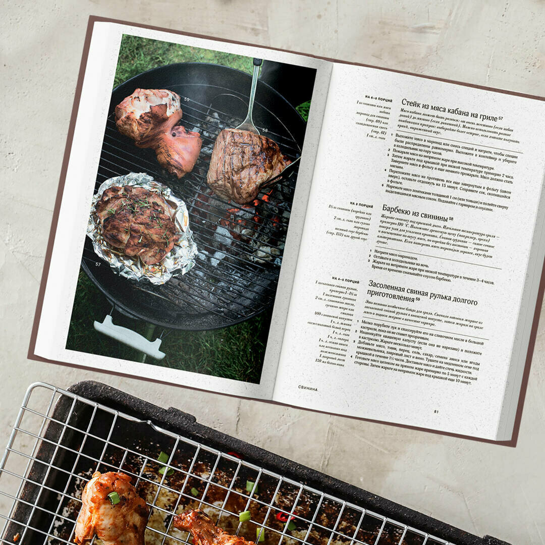 Изумительная книга! Красоты необыкновенной! Роскошный подарок семье, которая имеет дачу. Ведь сейчас все двинутся именно на дачи. Слишком долго сидели в квартирах. Пусть мы не будем приглашать друзей на вечерний костер. Но зато в кругу семьи, вместе с детьми и родителями, которые проводят с нами самоизоляцию, потопчем зеленую лужайку перед домом, подышим чистым воздухом, выложим эту книгу на дачный столик и примемся готовить! Мясо, птицу или рыбу, или и то, и другое, - кто во что горазд. Поверьте, даже знатокам гриля откроются неожиданные нюансы, когда они будут ее листать