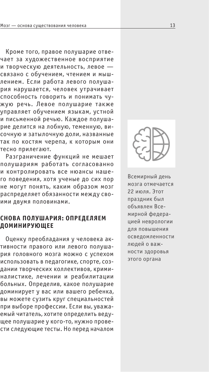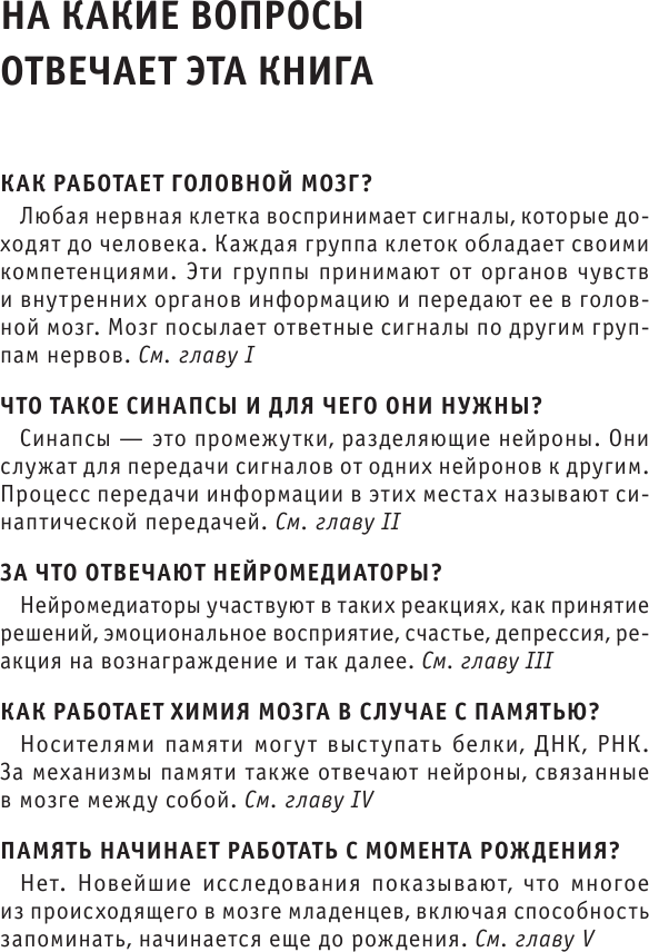 Начала читать эту книгу еще в электронном виде, отрывком на книжном сайте, и по мере прочтения поняла, что ххочу ее иметь у себя в бумажном варианте))) все, что касается работы мозга и воздействию на негот гормонов - этаинылрмация бесценна, потому что дает нам не просто понимание механизма функционирования самого важного органа в нашем теле, но и возможность корректировать и осознавать то или иное свое поведение, свои желания, свои эмоции. Из книги вы узнаете о работе всех частей нашего мозга, как действуют на него наши двидения., а так же запрещенные вещества. Много разнообразных фактов о мозге не только взрослого, но и младенца, а так же животных, периодические экскурсы в историю нейрофизиологии. Эта книга не учебник, она скорее подобии познавательной энциклопедии с элементами личностного развития. Внешне книжечка по типу брошюры, в картонной обложке, небольшого формата.