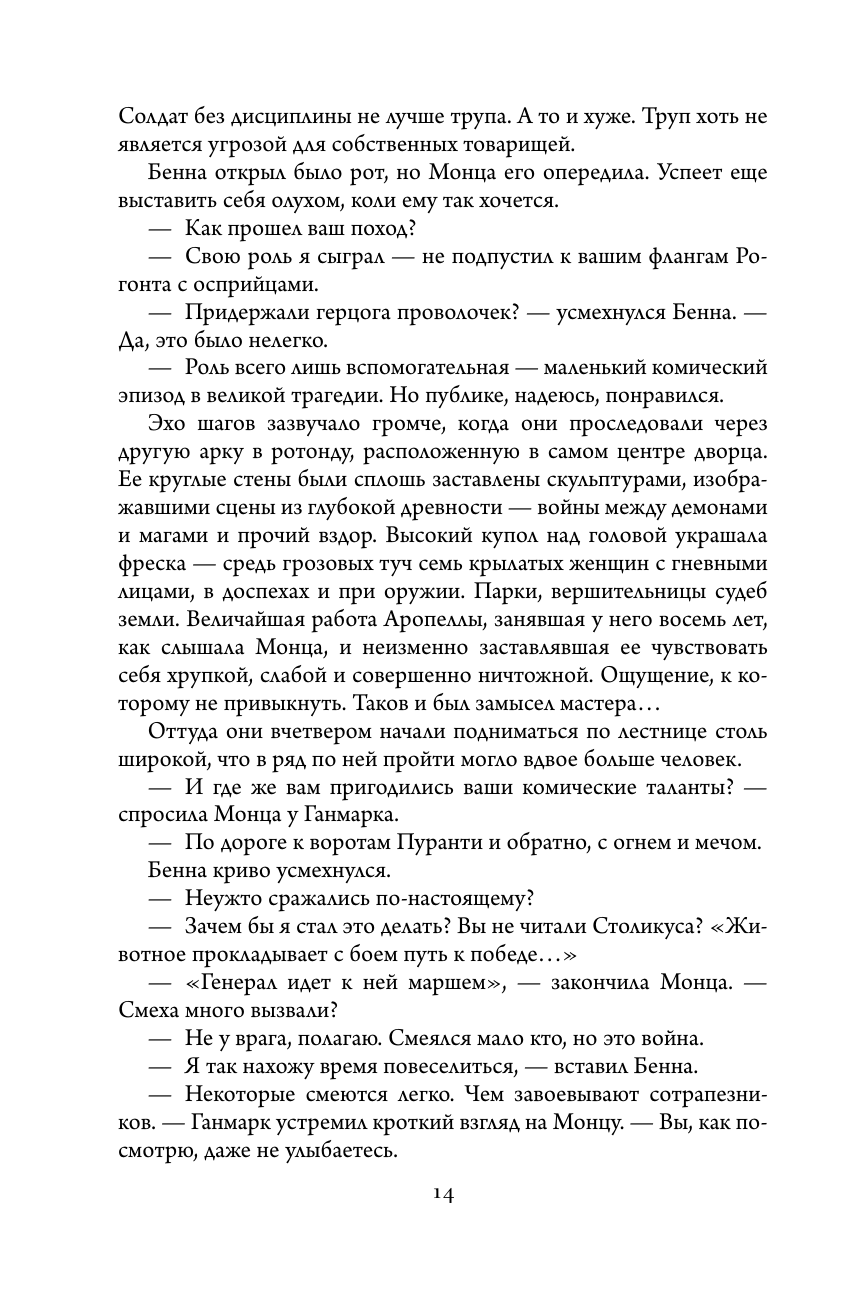 Композиция, кстати говоря, у «ЛПХ» очень даже напоминает ту, что была в «Первом Законе». Всё снова идет по кругу. Логен повторяет то, с чего начал, Монца тоже повторяет то, с чего начала. И речь не только о географических категориях, речь и о социальной роли, но только не об уровне самопонимания. Логен заметно вырос. Монца же сделалась много сильнее, хотя и сошла с пьедестала двух на пьедестал одного. А не в этом ли была слабая сторона Меркатто?