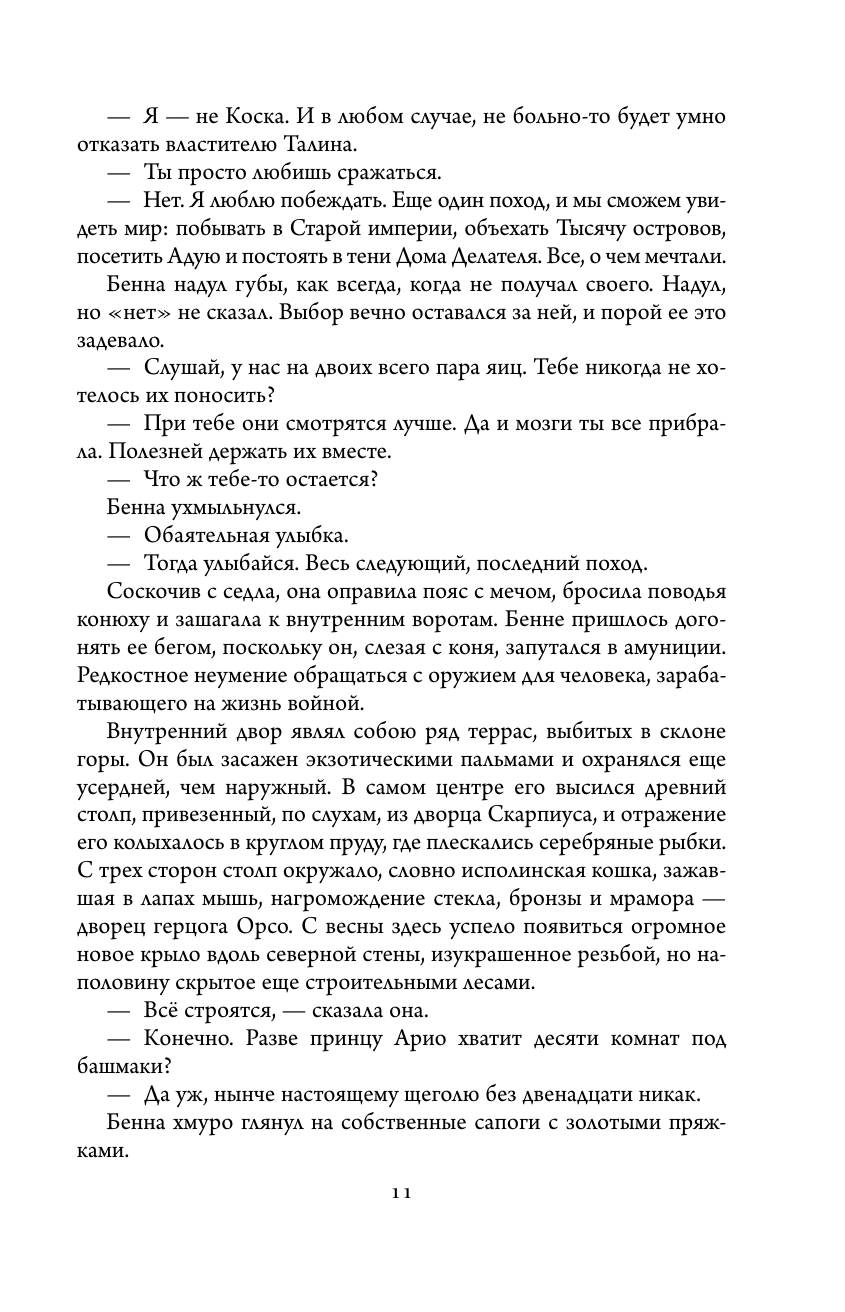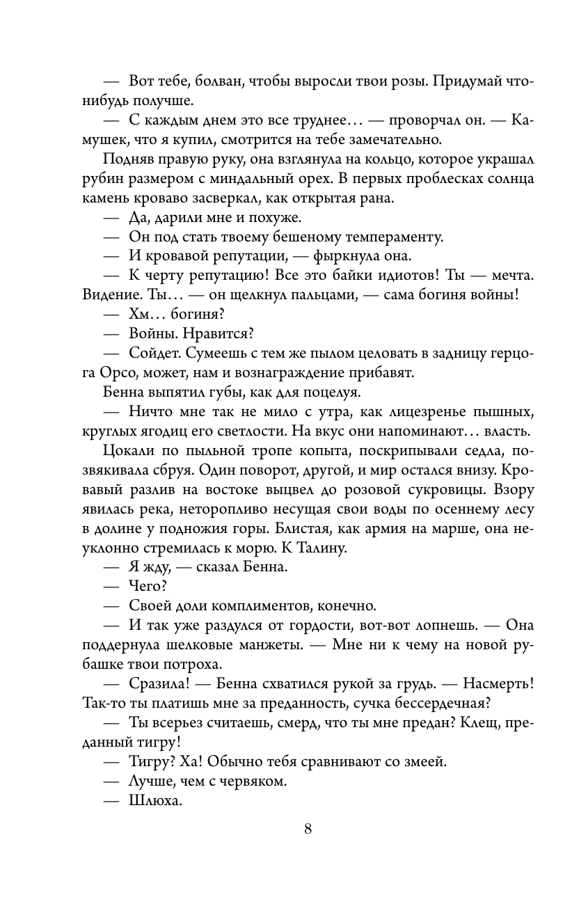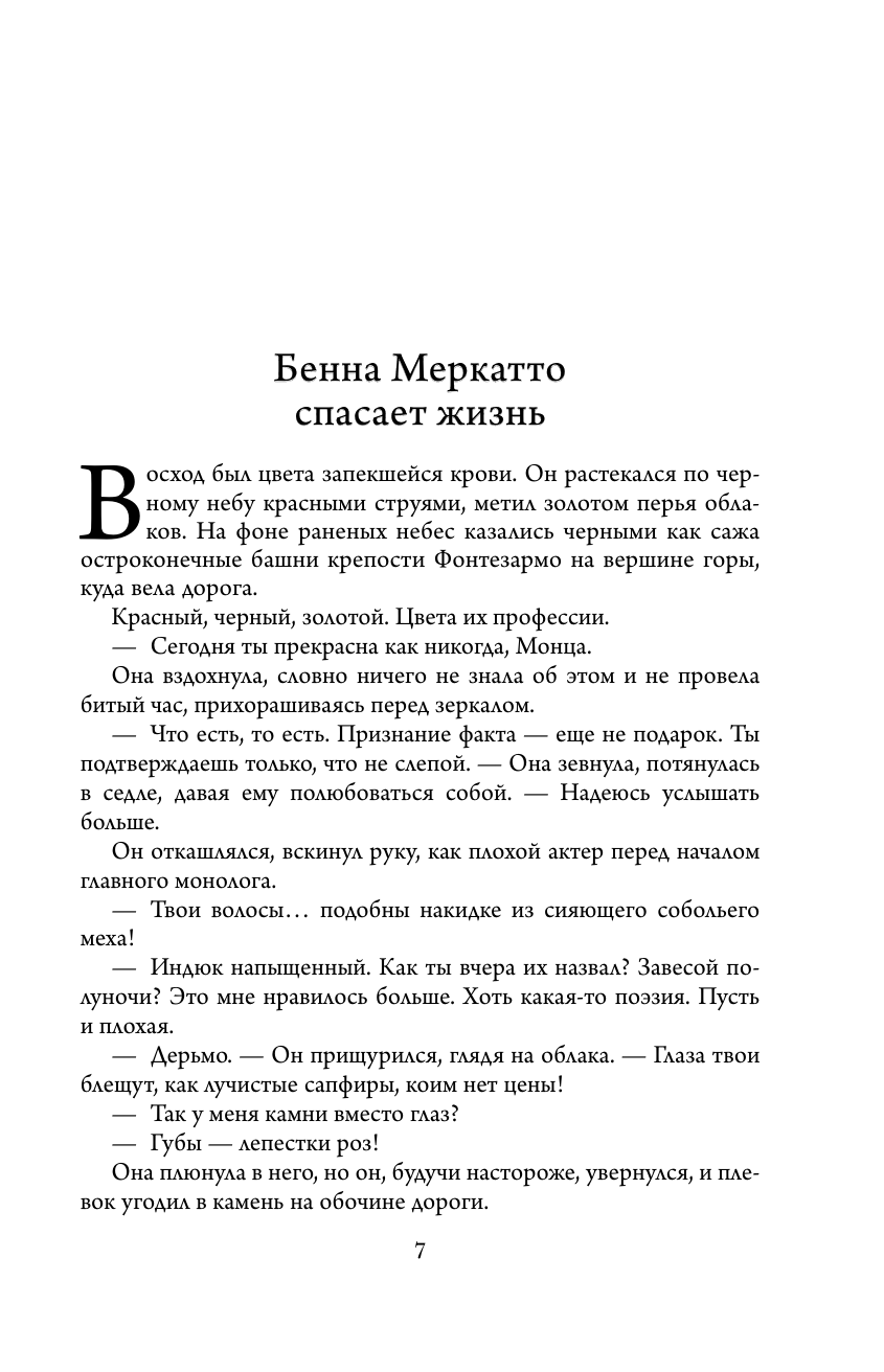 Влиятельный герцог Орсо не может позволить наемнице Монце Меркатто, Змее Талина, предводительнице Тысячи Мечей, захватить власть. Потерявшая брата и чудом выжившая, она идет на сделку с ворами, лицедеями и убийцами, чтобы отомстить предателю. Военные, политические интриги опутывают Стирию - и только месть Меркатто должна расставить все по местам.