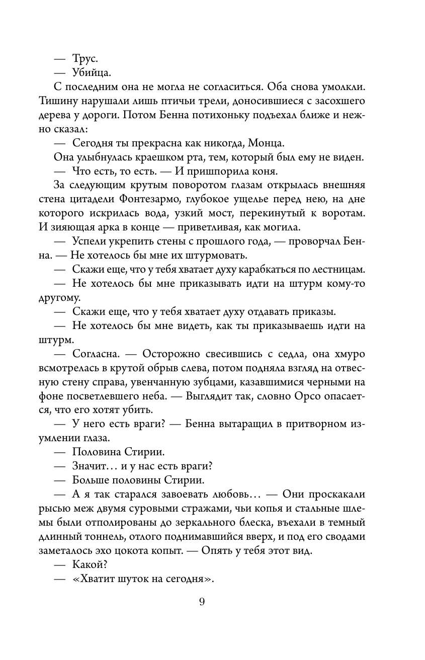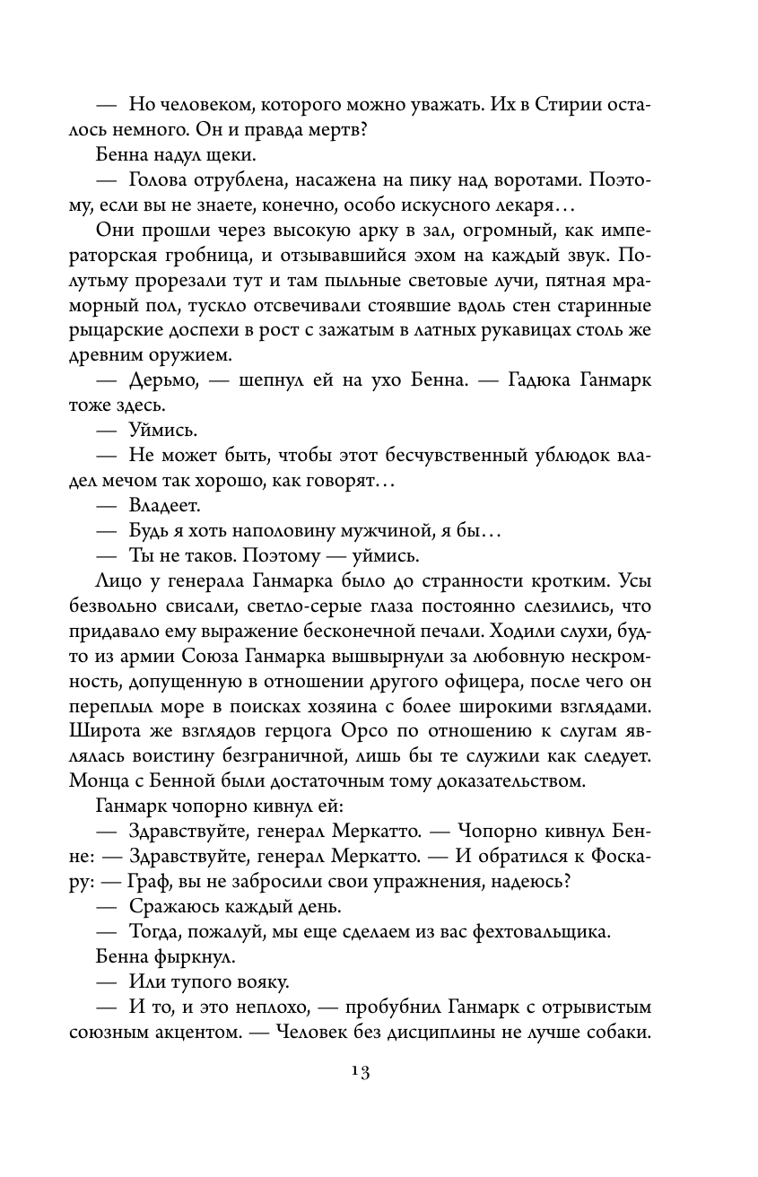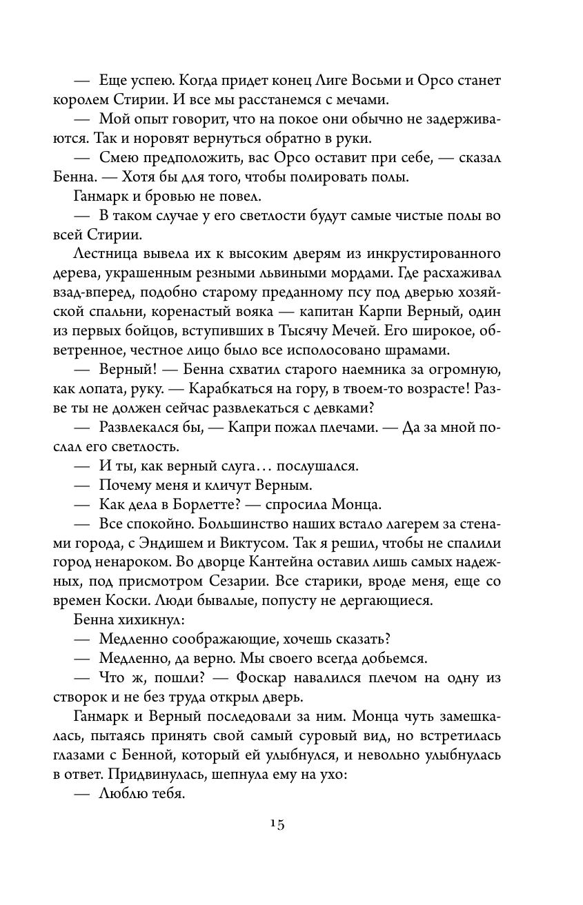 Влиятельный герцог Орсо не может позволить наемнице Монце Меркатто, Змее Талина, предводительнице Тысячи Мечей, захватить власть. Потерявшая брата и чудом выжившая, она идет на сделку с ворами, лицедеями и убийцами, чтобы отомстить предателю. Военные, политические интриги опутывают Стирию - и только месть Меркатто должна расставить все по местам.