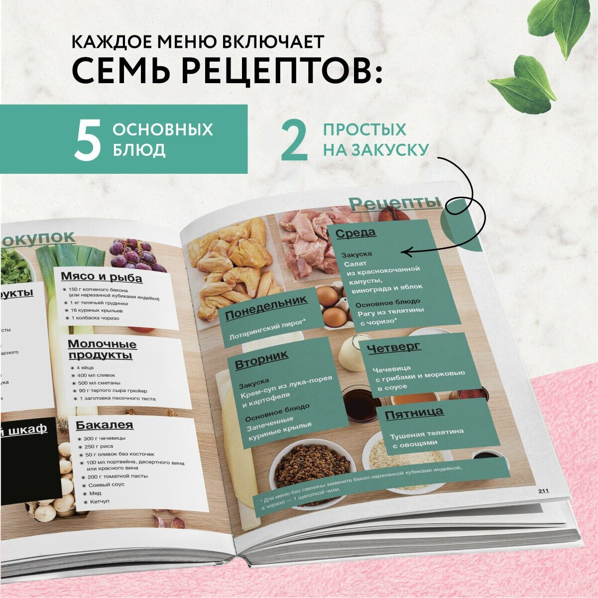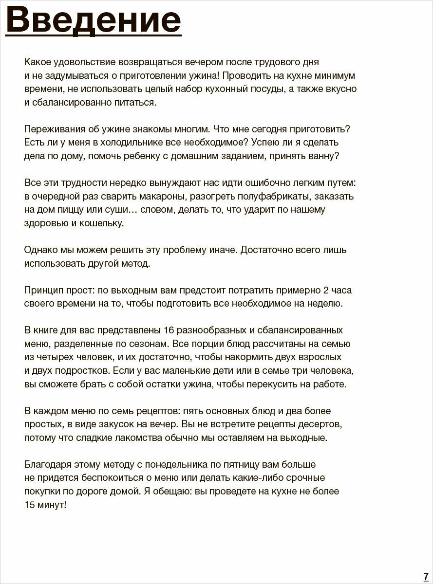 В книге есть меню, которые разбиты по сезонам, но думаю вы без проблем найдете все нужное в магазинах в любой сезон. Меню представляет собой список блюд, ингредиентов, которые вам понадобятся для данного варианта, пошаговое руководство как сделать заготовки в выходной день и руководство как доготовить блюдо в будни, когда вы соберетесь его есть. Сами блюда очень разнообразны, но при этом полезны, здесь много овощей, есть мясо и рыба. Книга позволит вам разнообразить свой рацион, рекомендую. -