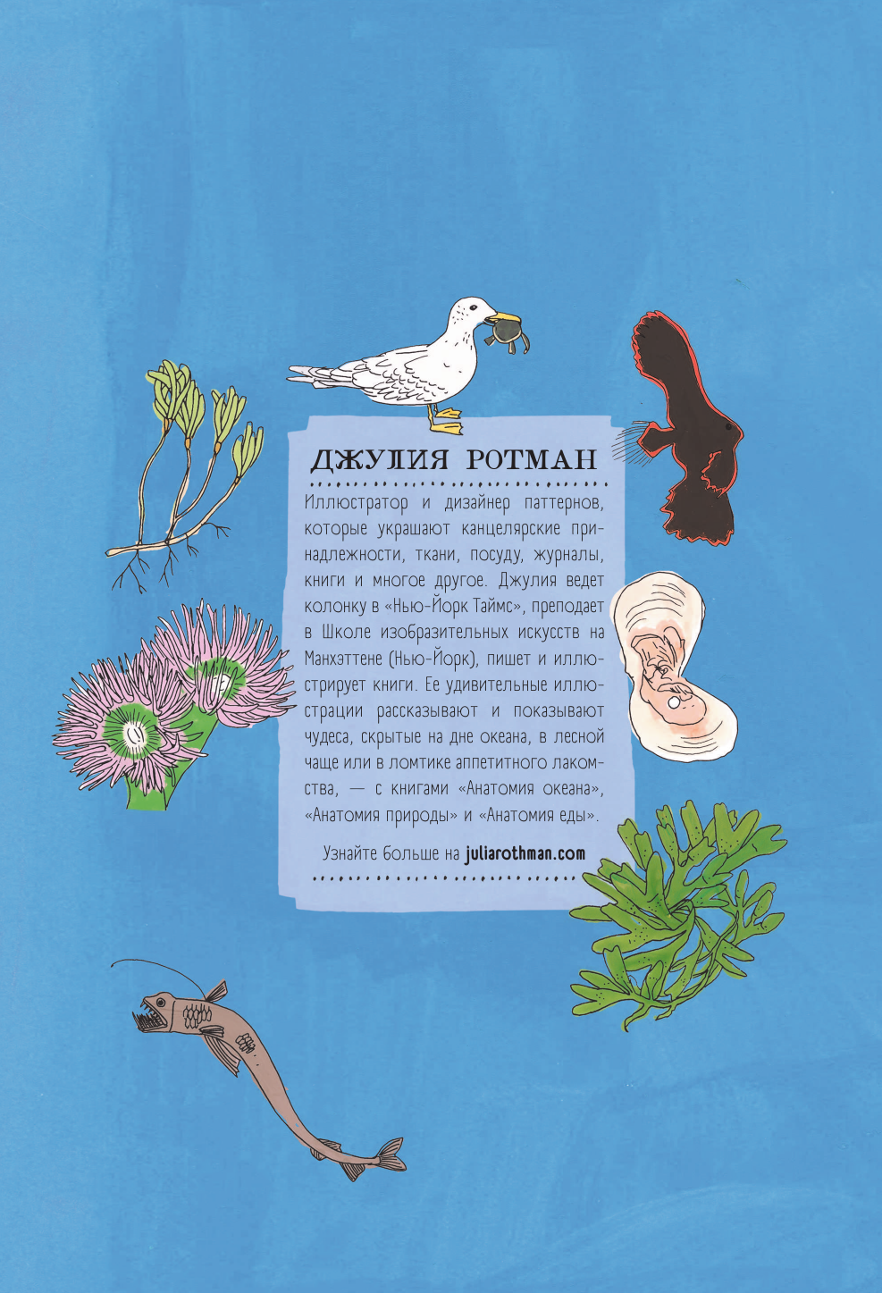 Исследуйте коралловые рифы, странствуйте по полярным морям и погружайтесь в глубины, чтобы познакомиться с их необычными обитателями. Восхитительные рисунки Джулии Ротман, сочетающие искусство и науку, отражают множество увлекательных аспектов жизни на поверхности моря и под его волнами.