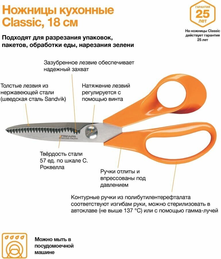 Кухонные ножницы оснащены винтом для регулировки лезвий. Данный инструмент используется для обработки различных продуктов, разрезания упаковок и т. п. Зазубренная рабочая часть выполнена из прочной нержавеющей стали. Рукоятки изготовлены из пластика. Ножницы можно мыть в посудомоечной машине. Подходят для разрезания упаковок, пакетов, обработки еды, нарезания зелени. Зазубренное лезвие обеспечивает надежный захват. Толстые лезвия из нержавеющей стали (шведская сталь Sandvik). Твёрдость стали 57 ед. по шкале С. Роквелла (57 Hrc). Натяжение лезвий регулируется с помощью винта. Контурные ручки из полибутилентерефталата соответствуют изгибам руки. Можно стерилизовать в автоклаве (не выше 137 °C) или с помощью гамма-лучей. Ручки отлиты и впрессованы под давлением. Длина 18 см. Вес 73 г. На ножницы Classic действует гарантия 25 лет.
