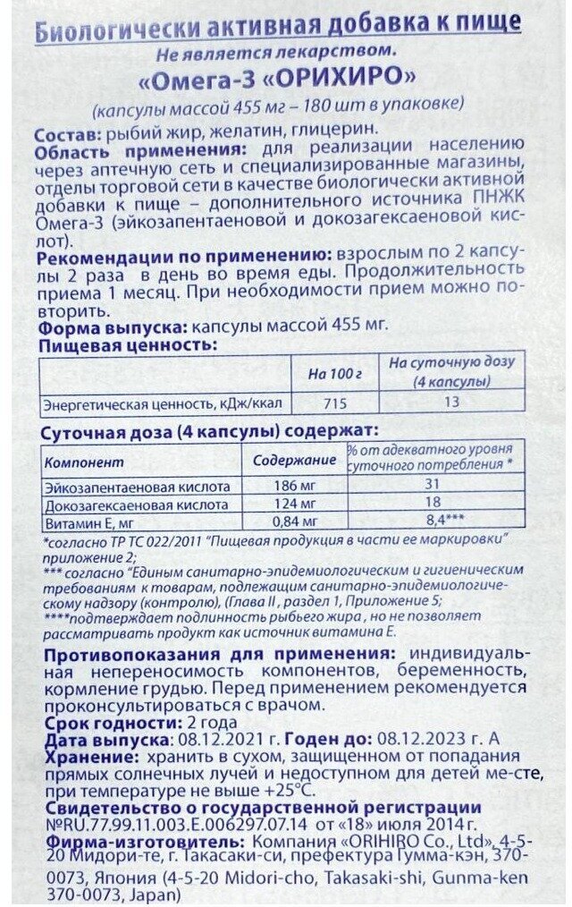 | Способ применения и дозы | Омега-3 принимают внутрь, взрослым и детям старше 12 лет — по 2 капсуле, детям 7-12 лет — по 1 капсуле 3 раза в день. Курс — 3 месяца (не менее). |