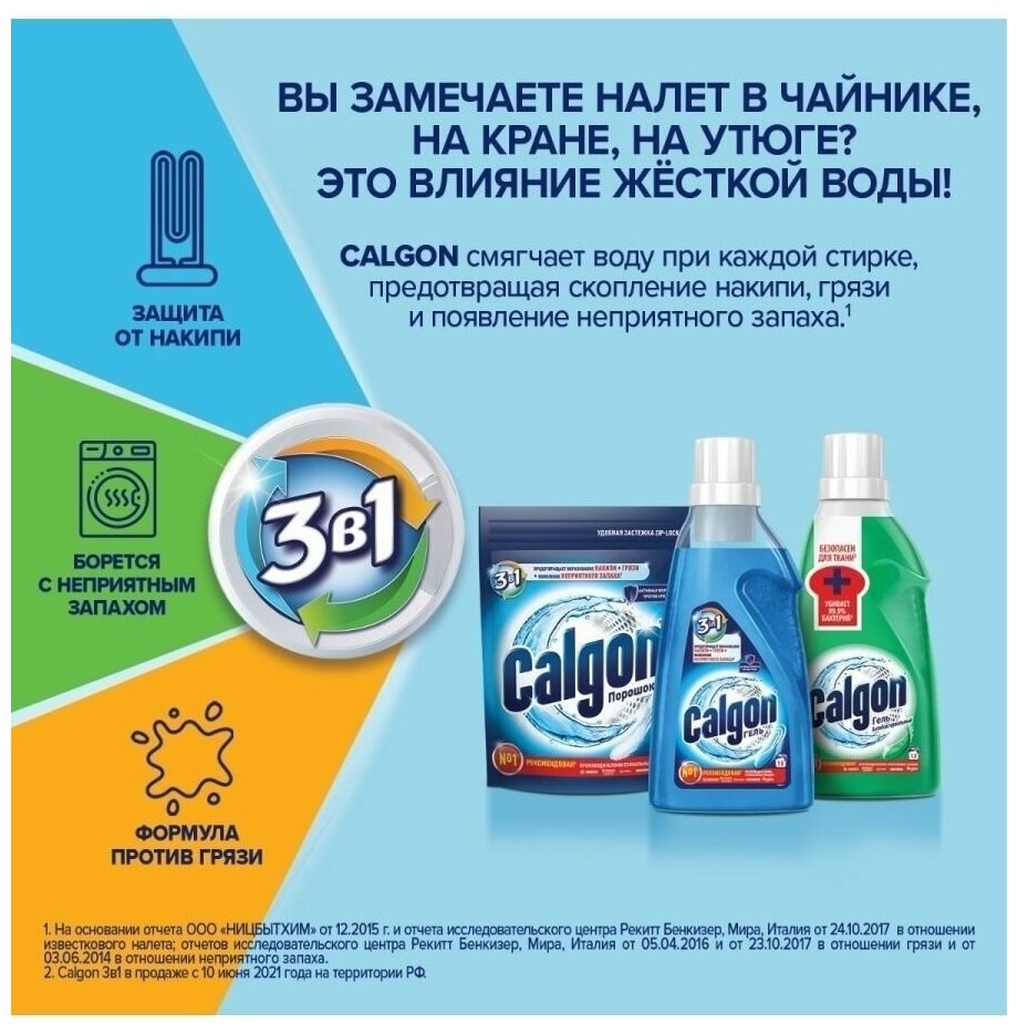 Calgon 3 в 1 для предотвращения образования накипи, грязи и появления неприятного запаха. Средство 1 среди смягчителей воды! Надежная защита от образования накипи на всех важных деталях стиральной машины, благодаря смягчению жесткой воды. Активная формула предотвращает скопление грязи, способствует поддержанию чистоты машины. Calgon предотвращает появление неприятного запаха в стиральной машине.