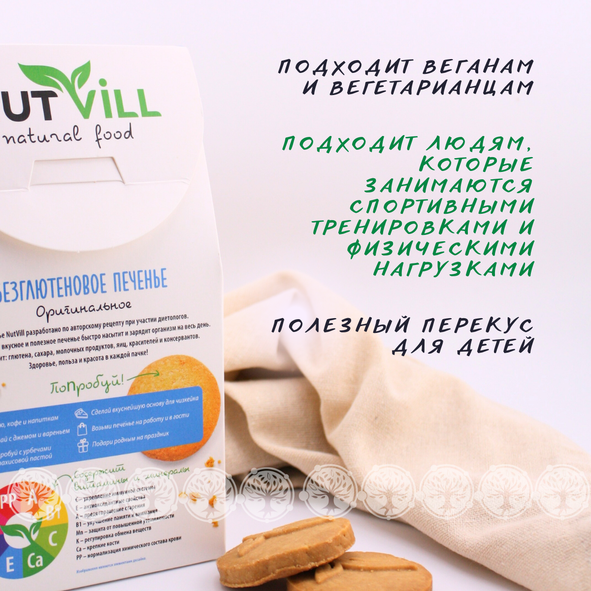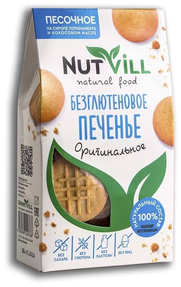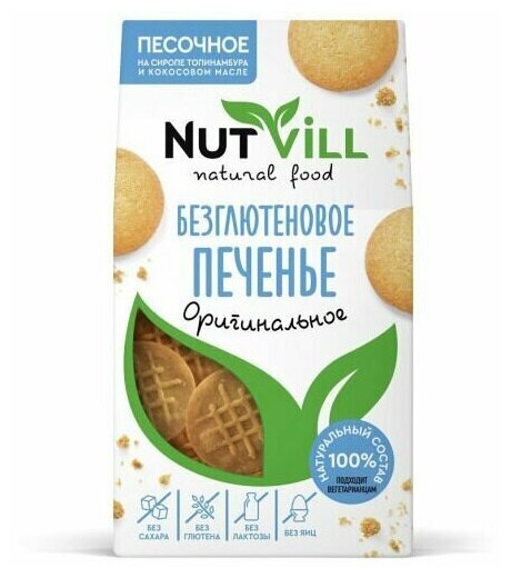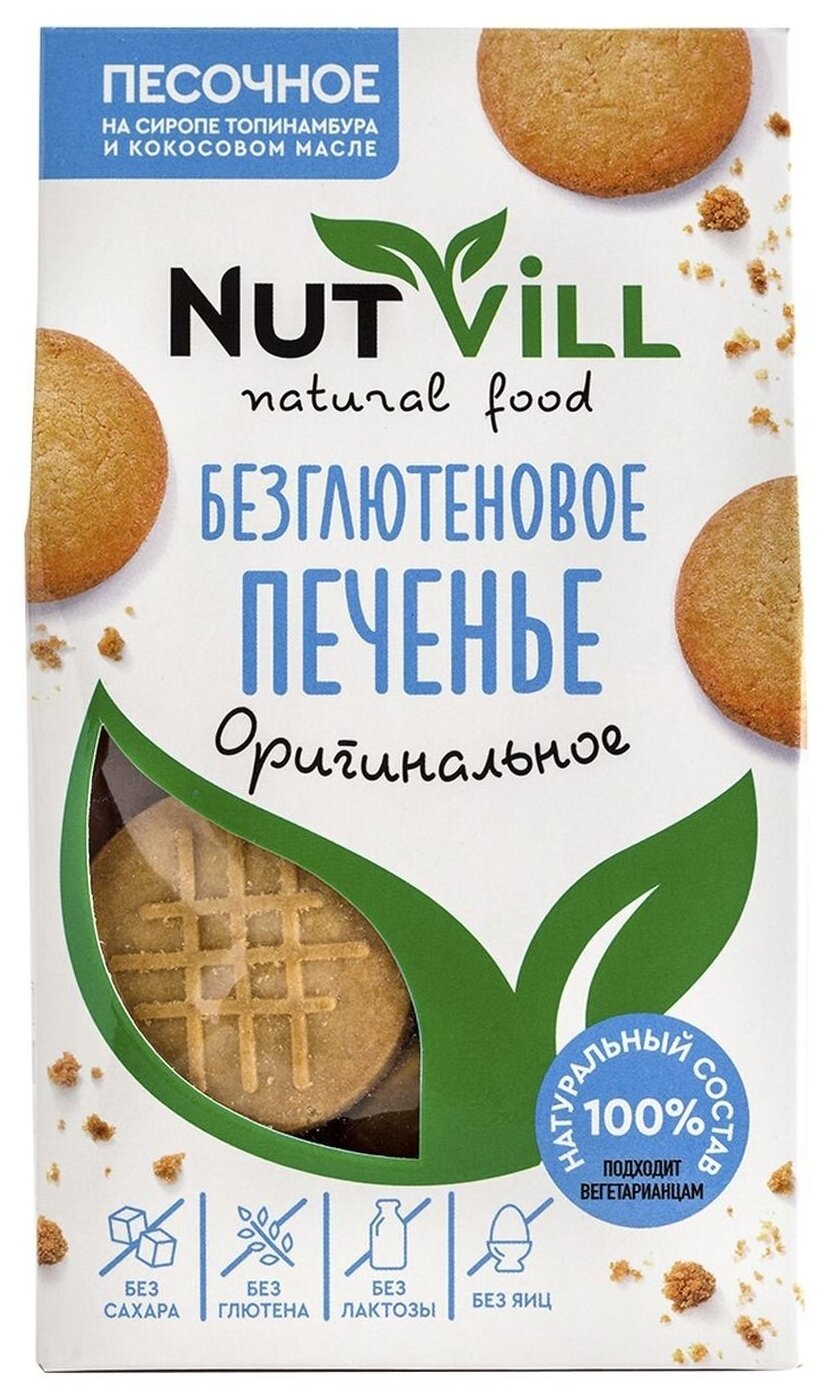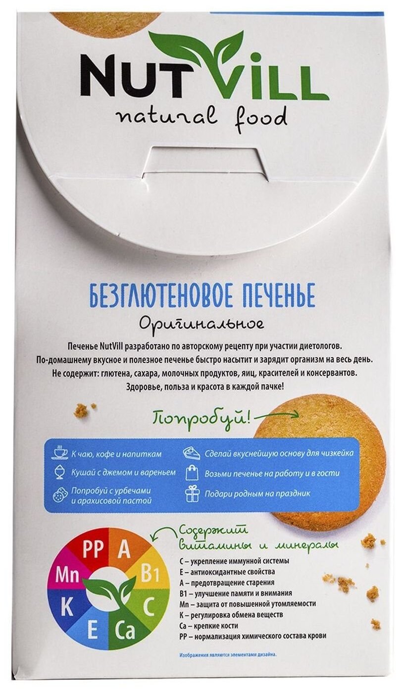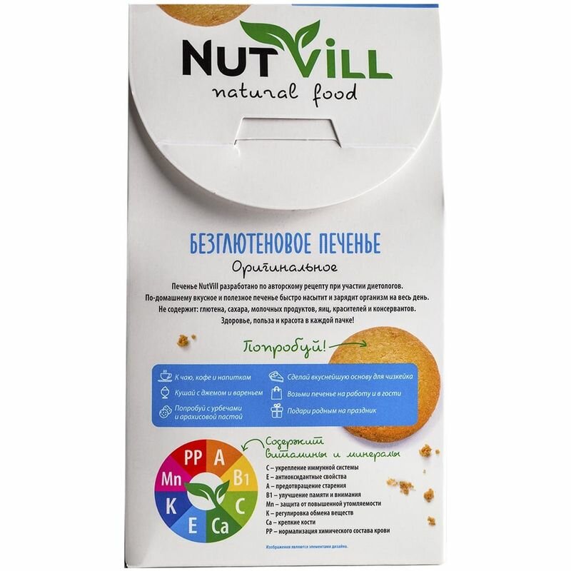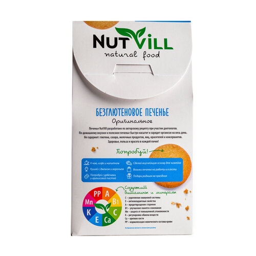 Печенье NutVill разработано по авторскому рецепту ведущими технологами при участии врачей-диетологов. Не содержит: глютена, сахара, молочных продуктов, яиц, красителей и консервантов. Печенье NutVill не только полезное, но и по-домашнему вкусное. Песочное печенье быстро насытит и зарядит организм на весь день. Здоровье, польза и красота в каждой пачке!