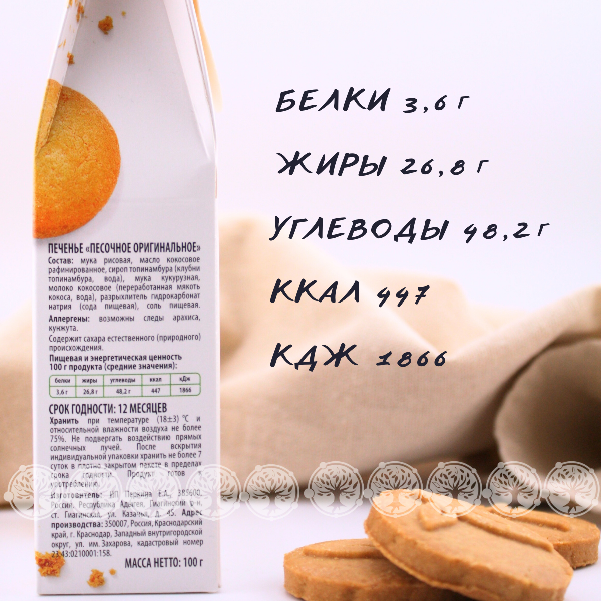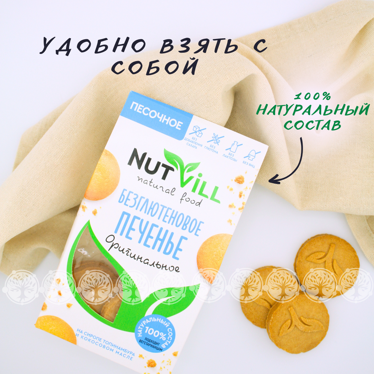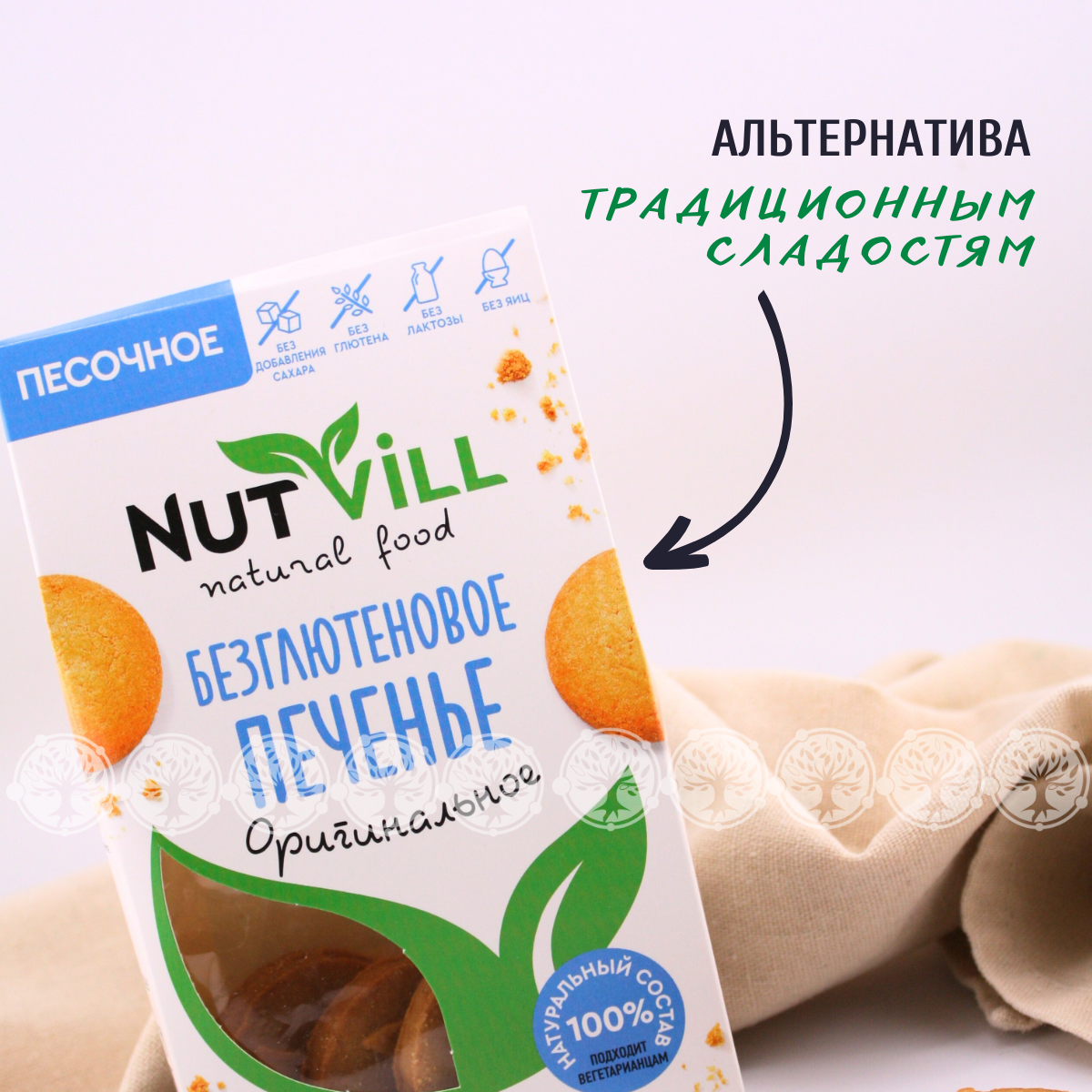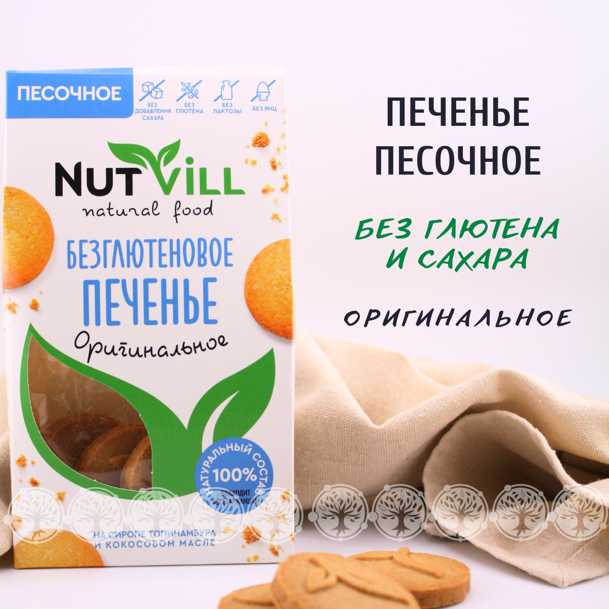 Печенье NutVill разработано по авторскому рецепту ведущими технологами при участии врачей-диетологов. Не содержит: глютена, сахара, молочных продуктов, яиц, красителей и консервантов. Печенье NutVill не только полезное, но и по-домашнему вкусное. Песочное печенье быстро насытит и зарядит организм на весь день. Здоровье, польза и красота в каждой пачке!