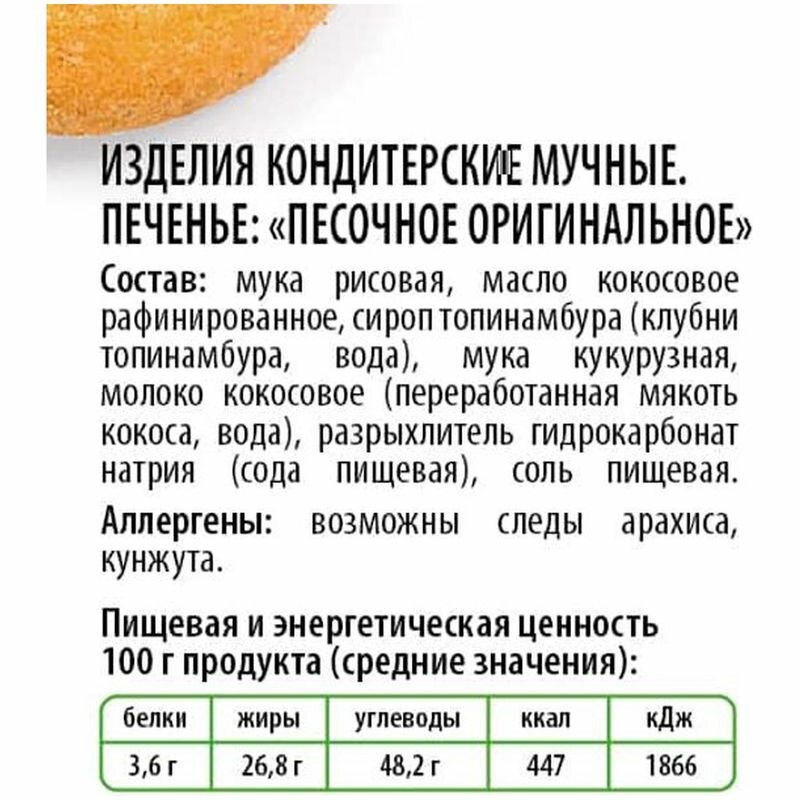 | Состав | Мука рисовая, масло кокосовое рафинированное, сироп топинамбура (клубни топинамбура, вода), мука кукурузная, молоко кокосовое (переработанная мякоть кокоса, вода), разрыхлитель гидрокарбонат натрия (сода пищевая), соль пищевая |