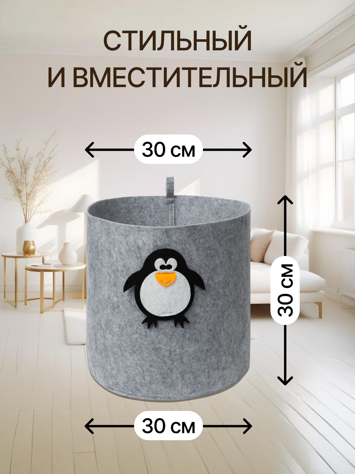 Универсальный органайзер, выполнен из плотного синтетического войлока. Это мягкий экологичный материал, приятный на ощупь, благородного серого цвета. Органайзер имеет цилиндрическую форму, украшен аппликацией в виде пингвина. На корзинке есть петля, для удобства подвешивания на крючке в ванной либо детской комнате.