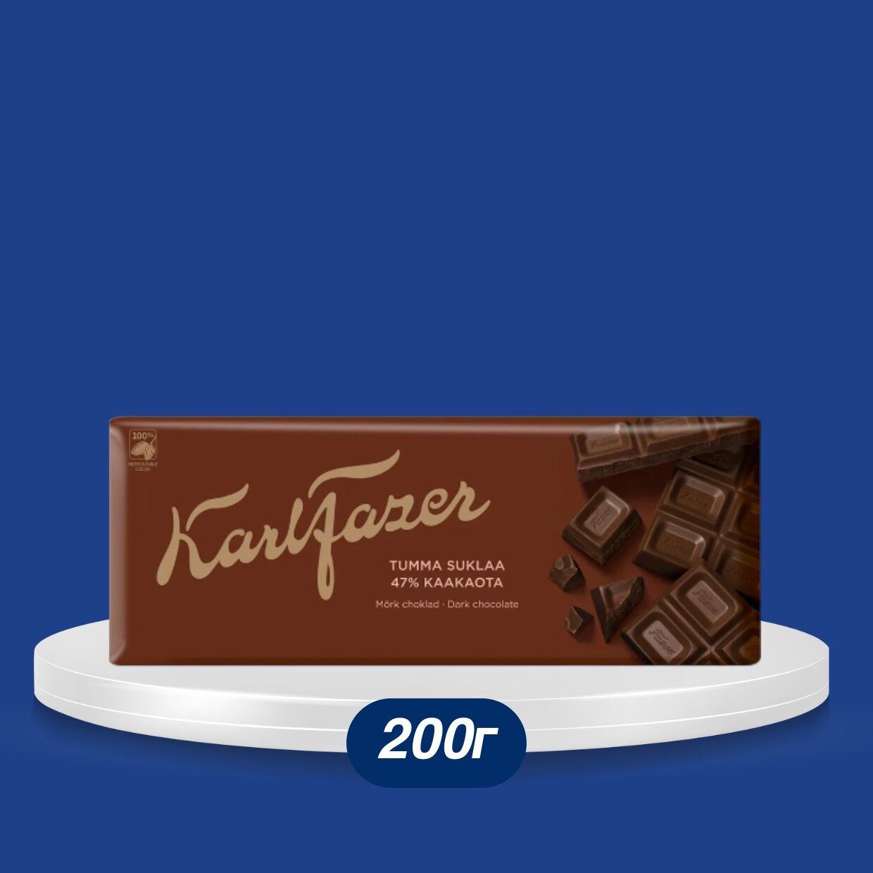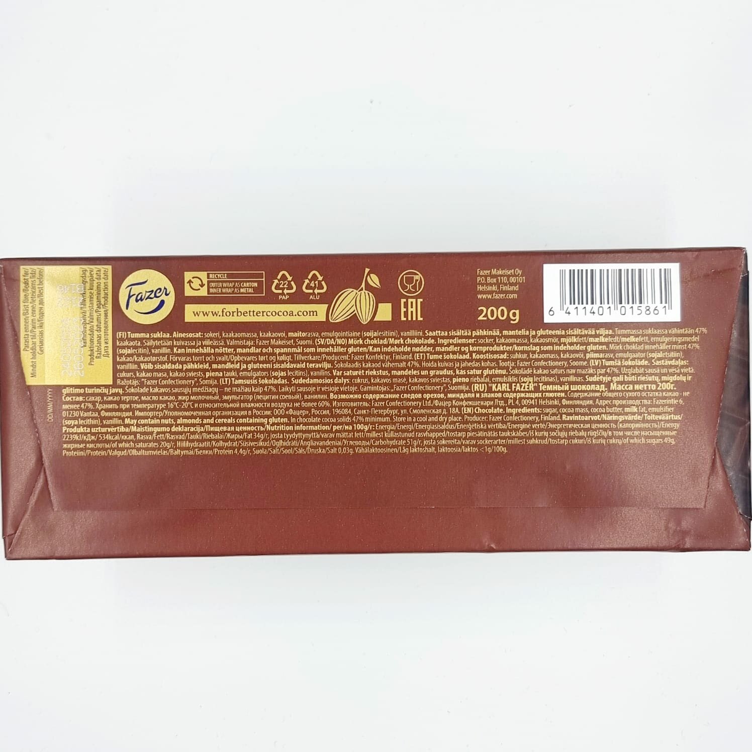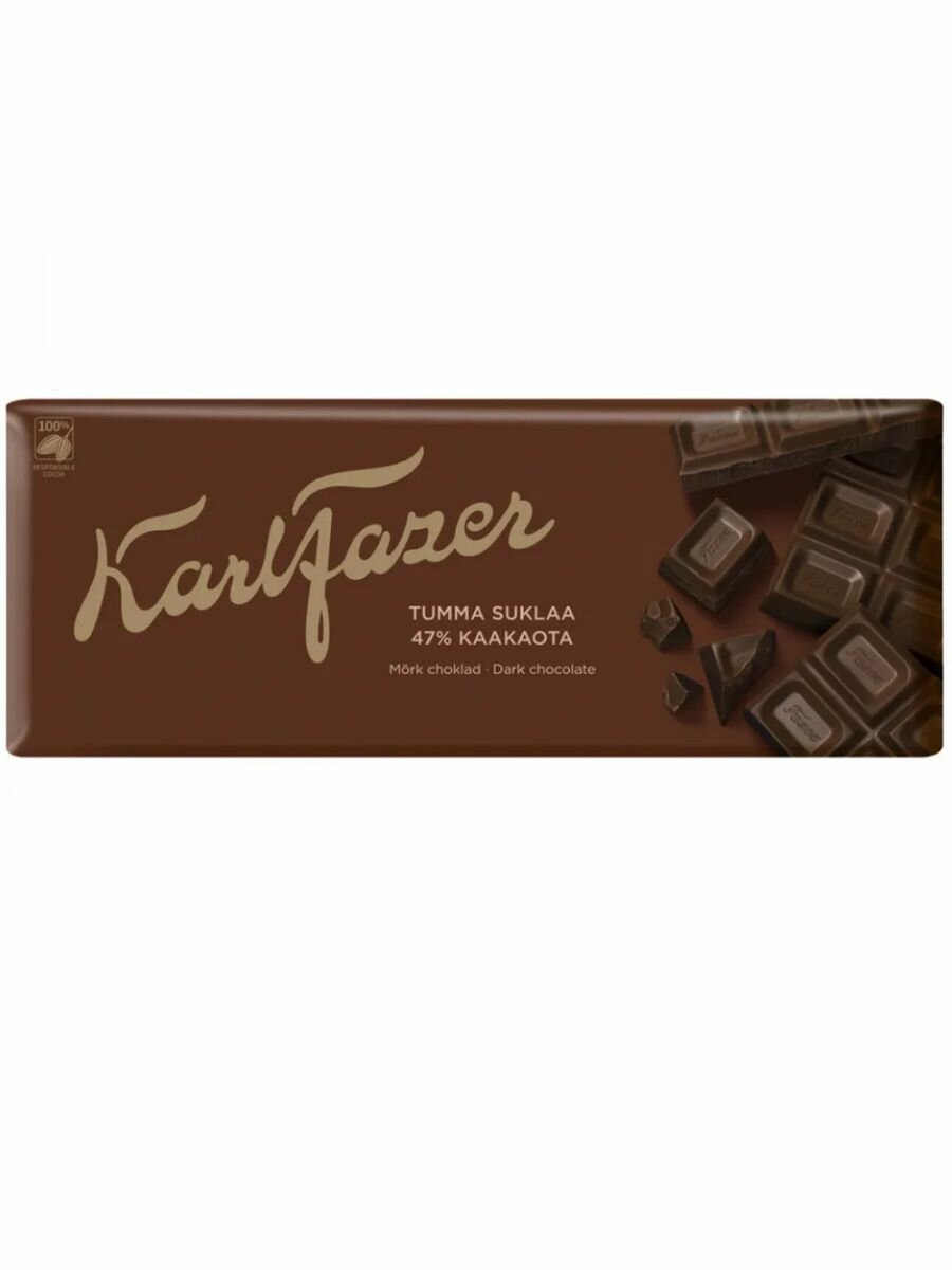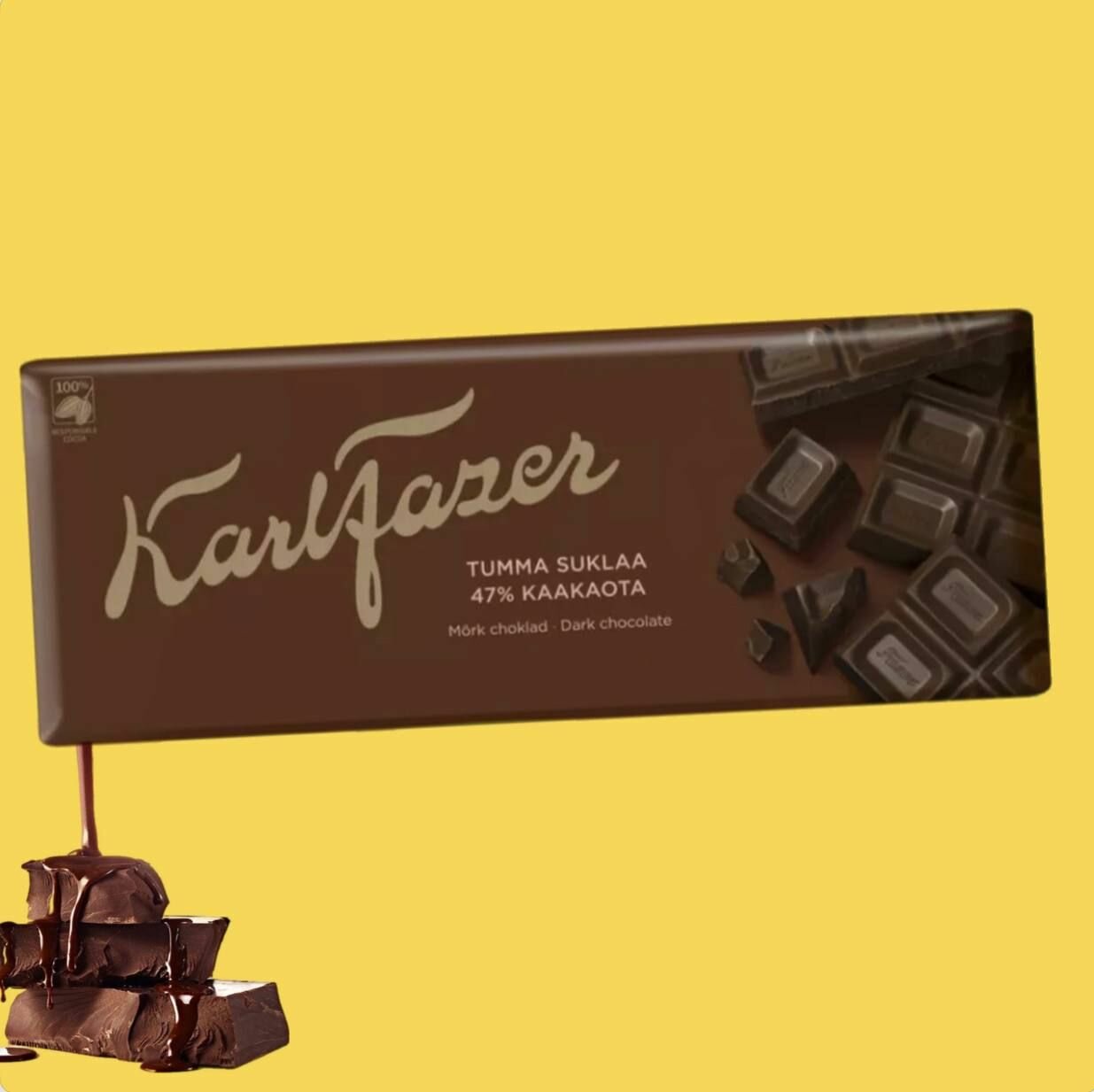 Наслаждайтесь каждым кусочком темного шоколада Karl Fazer c благородным и насыщенным вкусом какао.