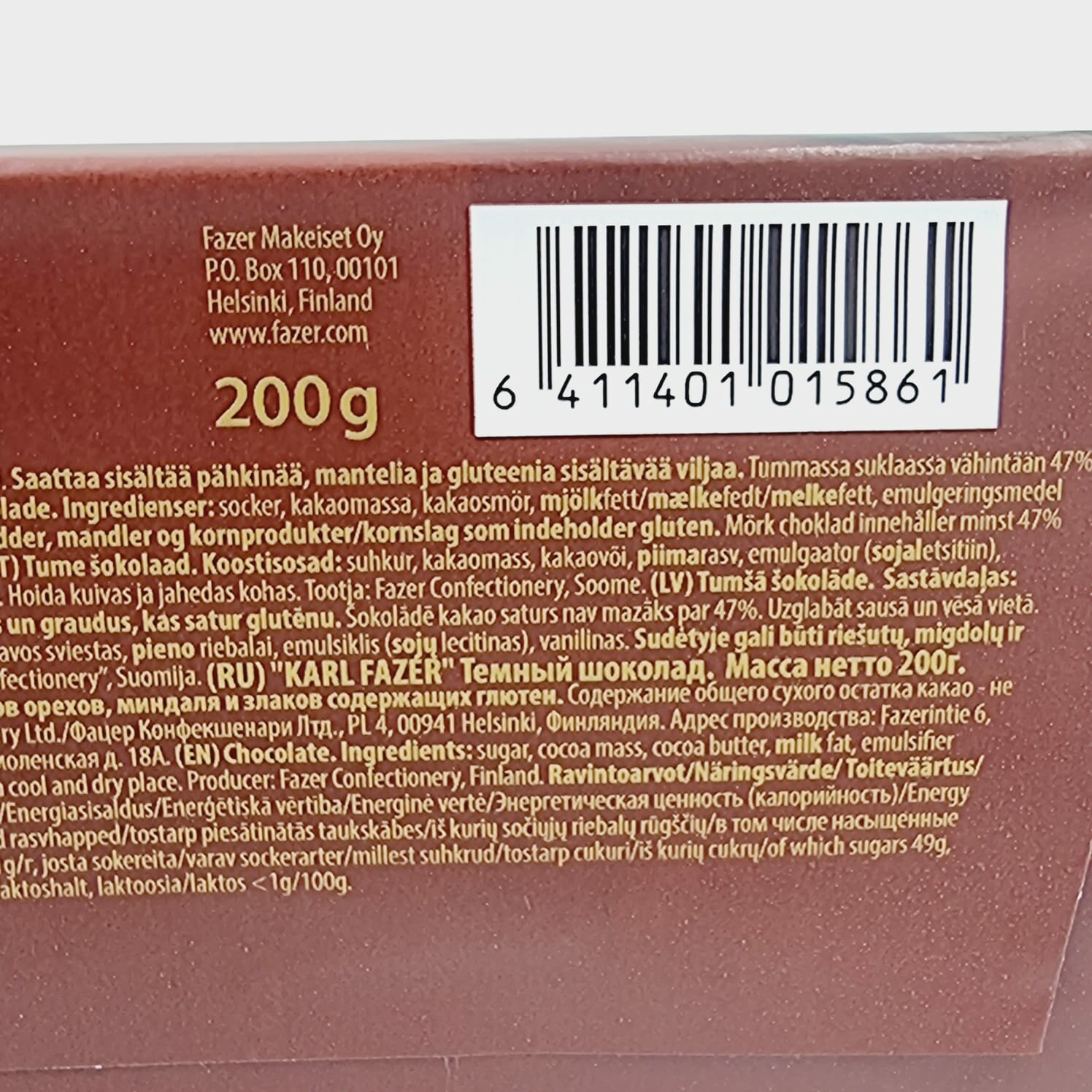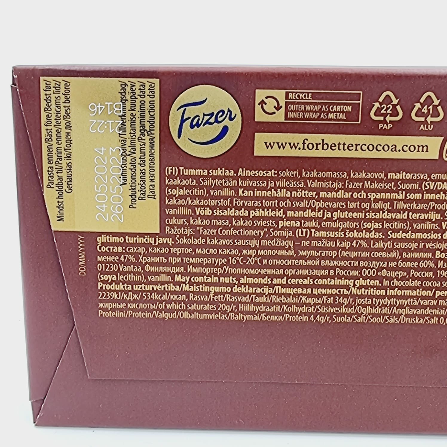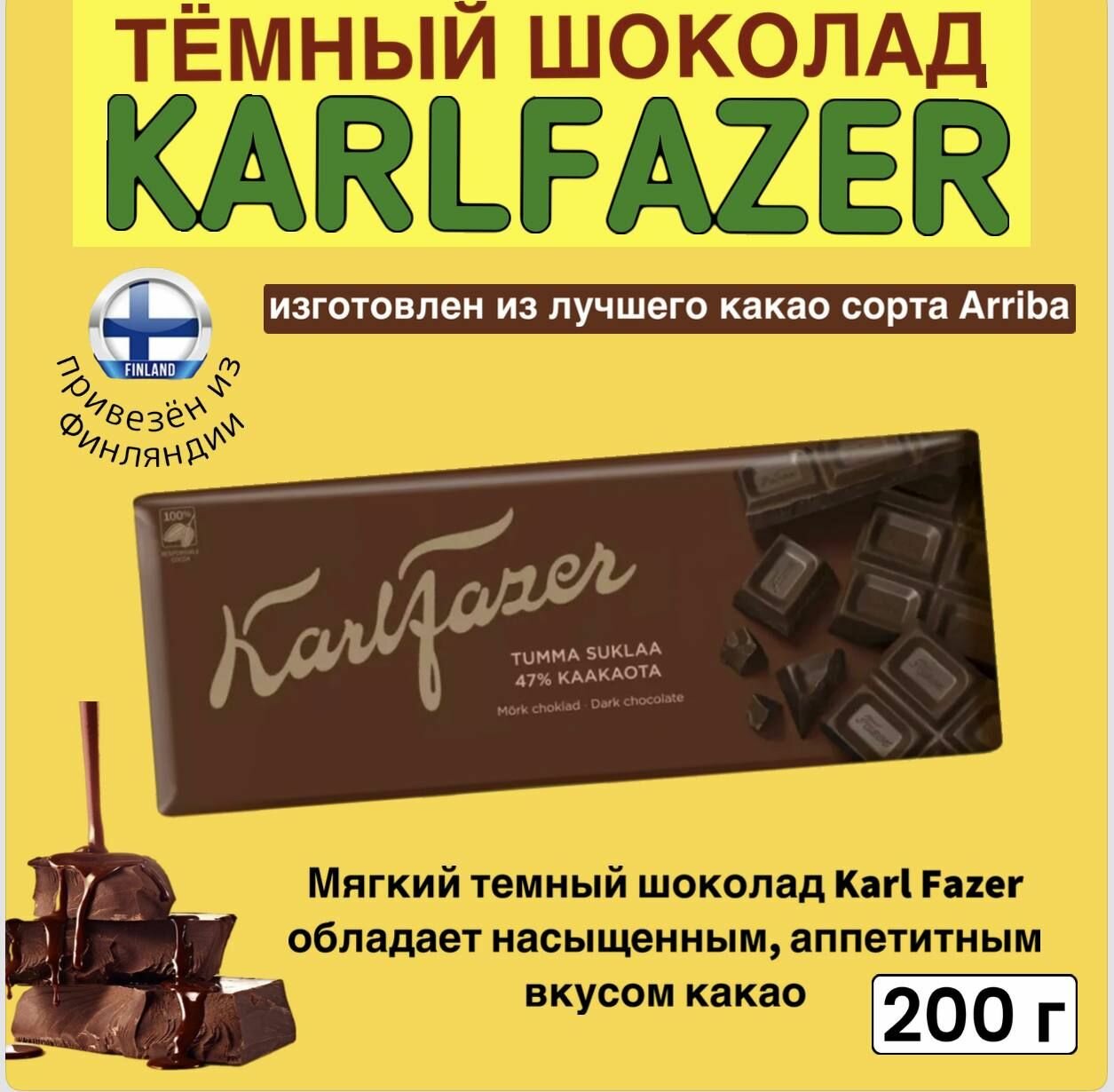 Наслаждайтесь каждым кусочком темного шоколада Karl Fazer c благородным и насыщенным вкусом какао.
