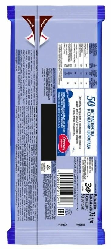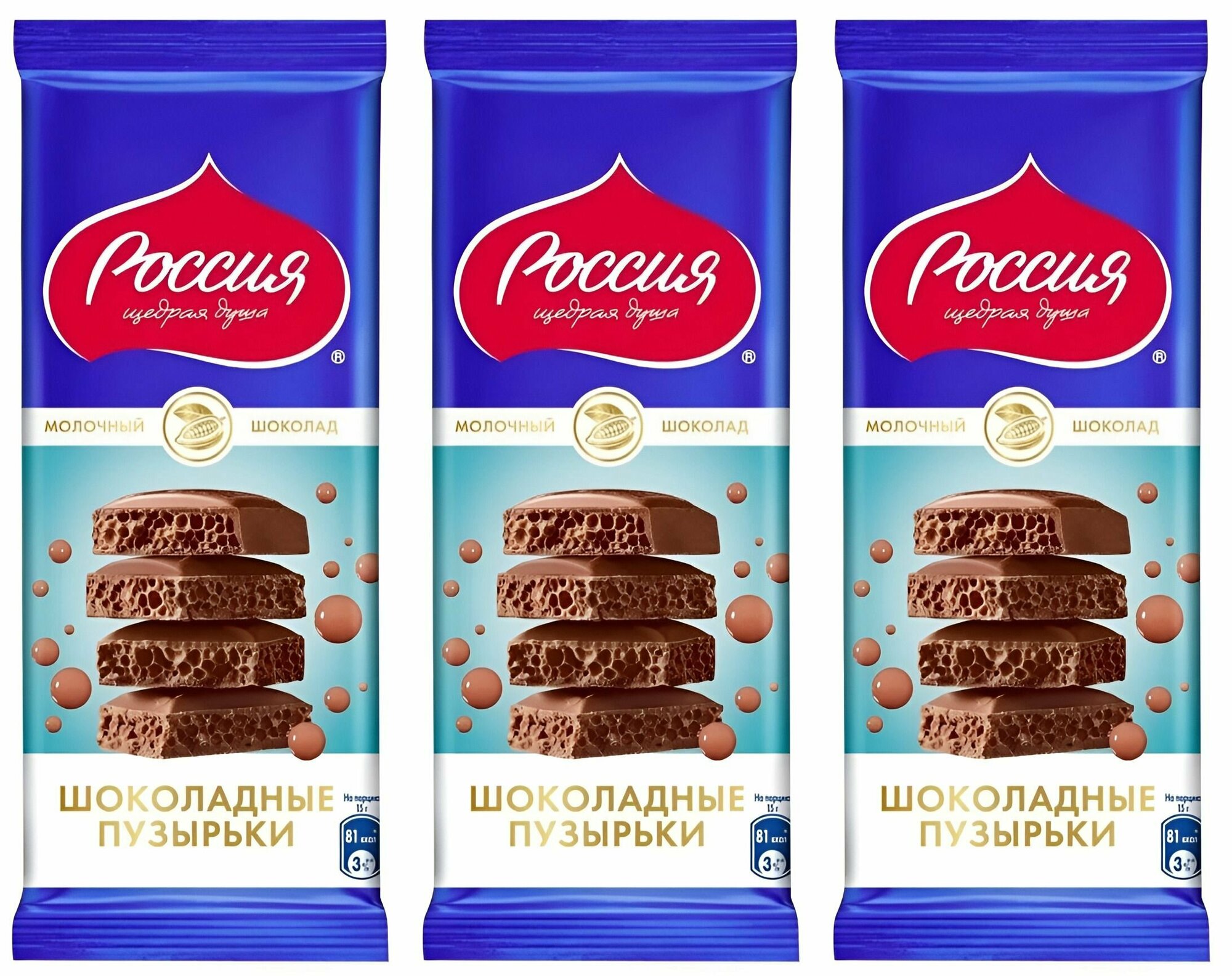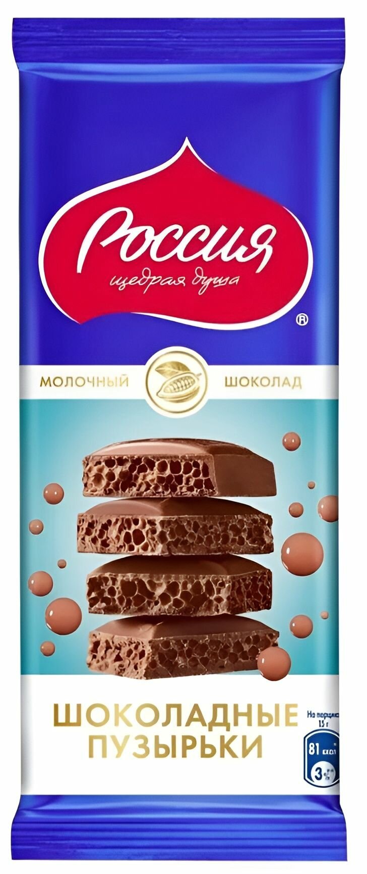 "Шоколадные пузырьки" от бренда "Россия" - Щедрая душа! - это нежная воздушная классика, способная растопить ваши сердца. Отборное молоко, качественные какао-бобы и элегантный дизайн упаковки доставят вам эстетическое и гастрономическое удовольствие. Изящная обновленная форма дольки шоколада раскрывает весь яркий и насыщенный молочный вкус. Воздушные пузырьки в шоколаде медленно таят во рту, продлевая ваше удовольствие.