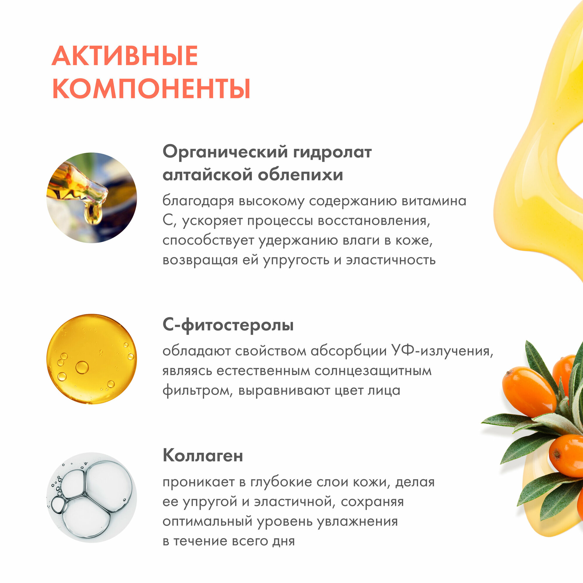 | Химический состав | Aqua with infusions of Hippophae Rhamnoides Fruit WaterWHH (органический гидролат алтайской облепихи), Melilotus Albus Flower/Leaf/Stem Extract* (экстракт донника), Achillea Asiatica Flower/Leaf/Stem ExtractWH* (экстракт тысячелистника азиатского), Aralia Mandshurica Leaf/Stem ExtractWH* (экстракт аралии маньчжурской), Rhodiola Rosea Root Water* (гидролат родиолы розовой), Chamomilla Recutita Flower Extract* (экстракт ромашки), Calendula Ofcinalis Flower Extract*(экстракт календулы), Hippophae Rhamnoides Fruit Oil* (органическое масло облепихи), Glycerin, Sodium Ascorbyl Phosphate (витамин С), Hydrolyzed Wheat Protein (растительный коллаген), Phospholipids, Glycine Soja Oil, Glycolipids, Glycine Soja Sterols (фитостеролы), Tocopheryl Acetate (витамин Е), Retinyl Palmitate (витамин А), Xanthan Gum, Cocoyl Proline, Citric Acid, Benzyl Alcohol, Sodium Benzoate, Potassium Sorbate, Parfum, CI 19140. (WHH) – гидролаты дикосборного органического растения *- Органические ингредиенты (WH) – Органические экстракты дикорастущих растений Сибири. |