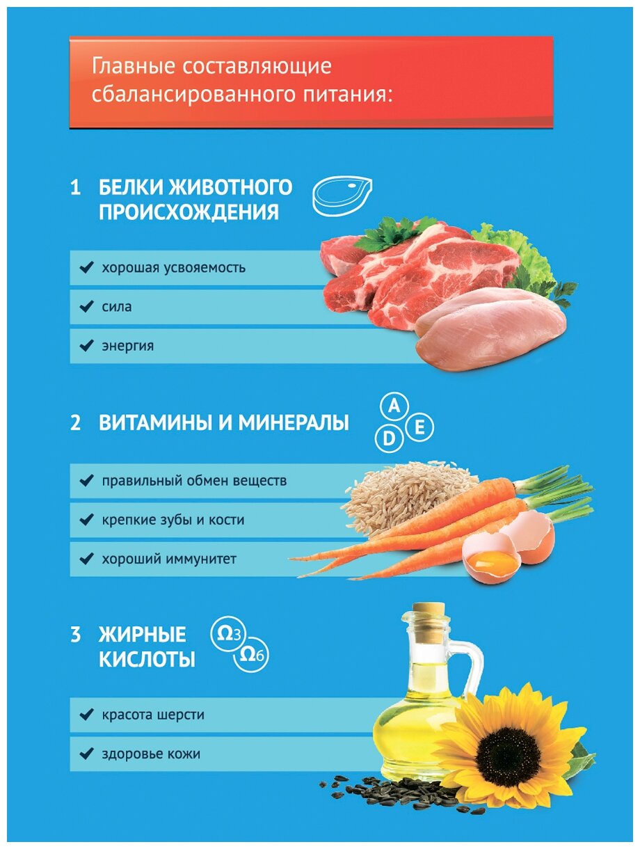 Сухой корм для собак всех пород имеет превосходный вкус, который достигается за счет высокого содержания белка животного происхождения. Натуральные ингредиенты корма богаты макро- и микроэлементами, необходимыми для полноценной и активной жизни.