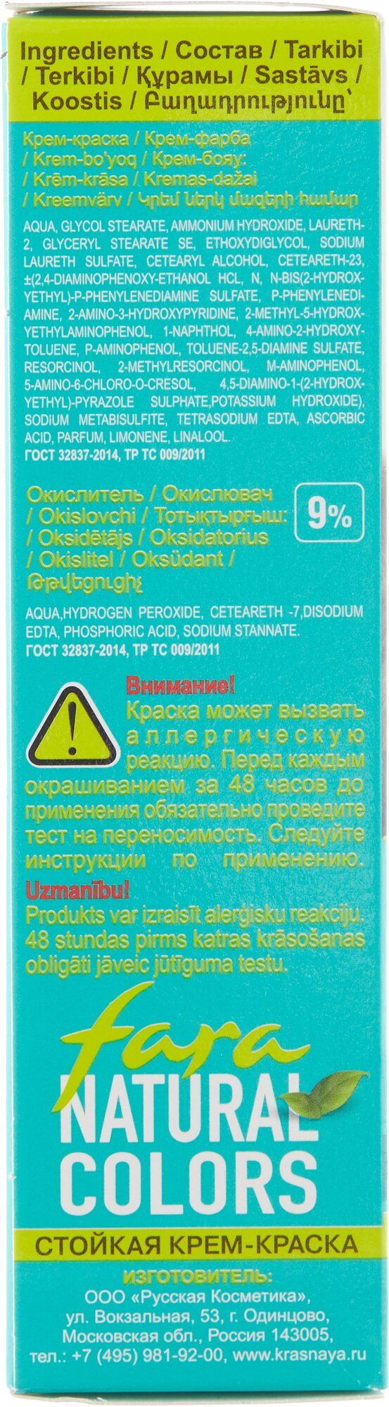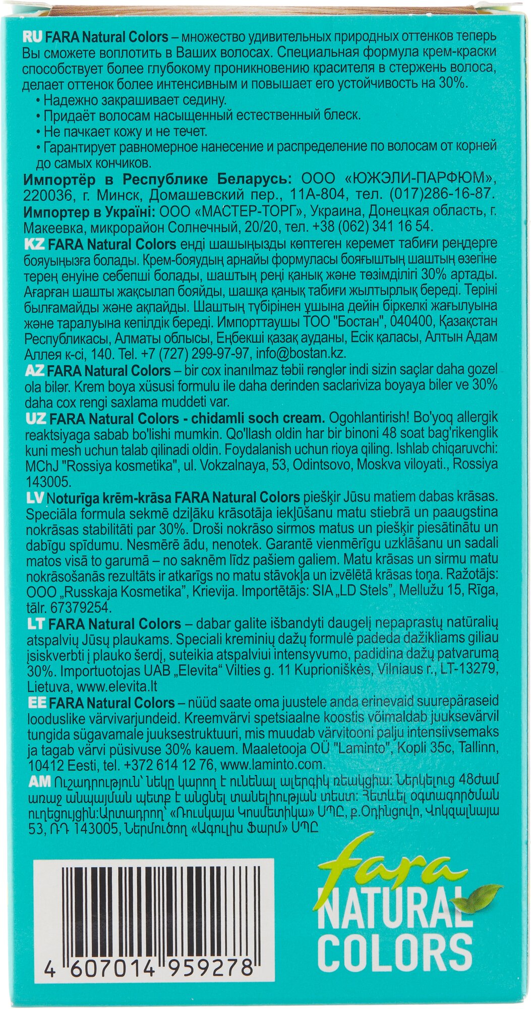 FARA Natural Colors — профессионал в области окрашивания и ухода за волосами. Специальная формула крем-краски способствует более глубокому проникновению красителя в стержень волоса, делает оттенок более интенсивным и повышает его устойчивость на 30 %. Результат окрашивания: - надёжно закрашивает седину; - придаёт волосам насыщенный естественный блеск; - не пачкает кожу и не течёт;- гарантирует равномерное нанесение и распределение по волосам от корней до самых кончиков.