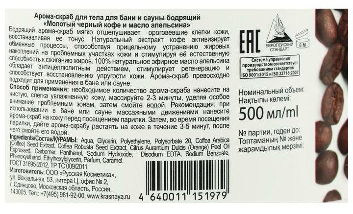 Скраб для тела Особая серия Бодрящий с молотым черным кофе и маслом апельсина 500мл