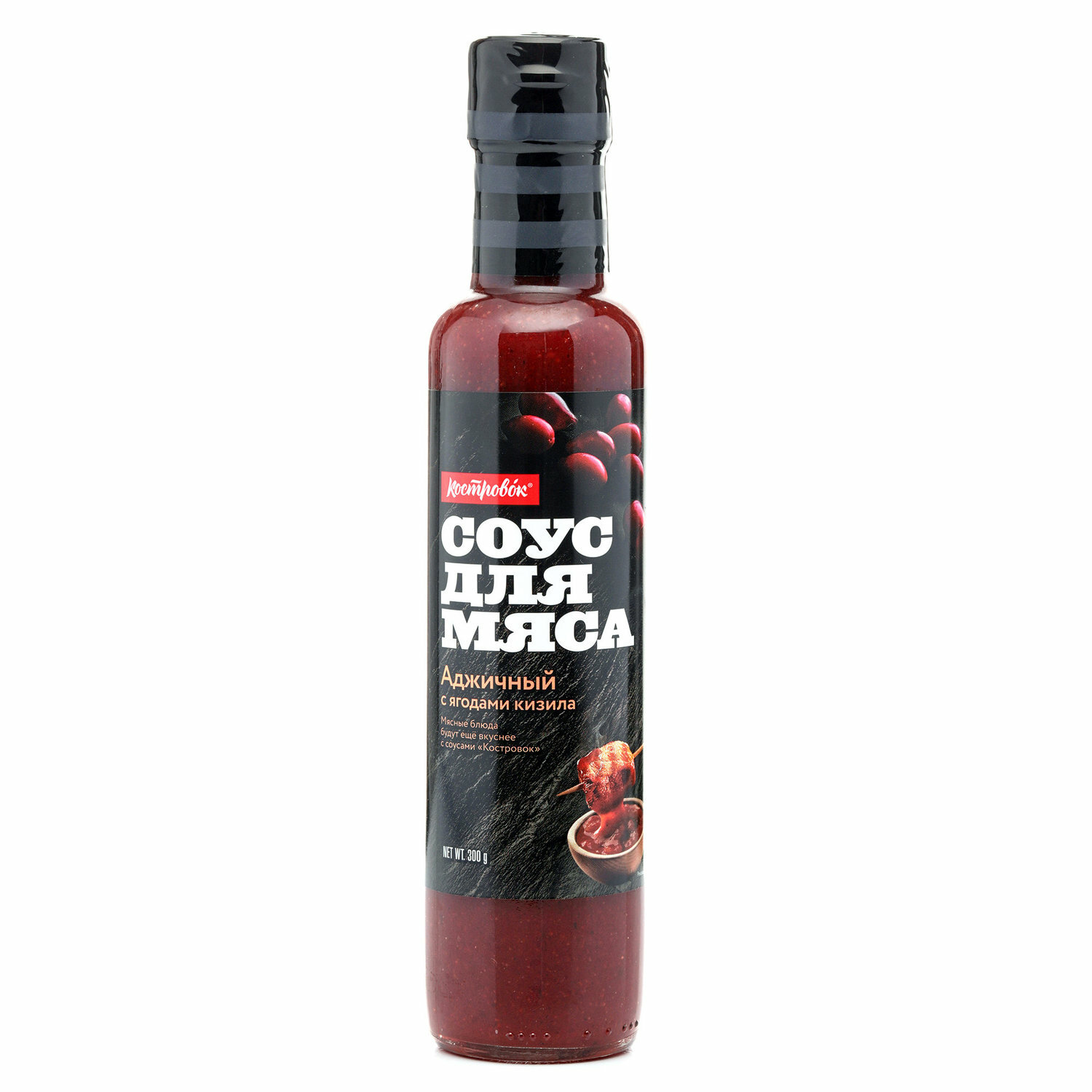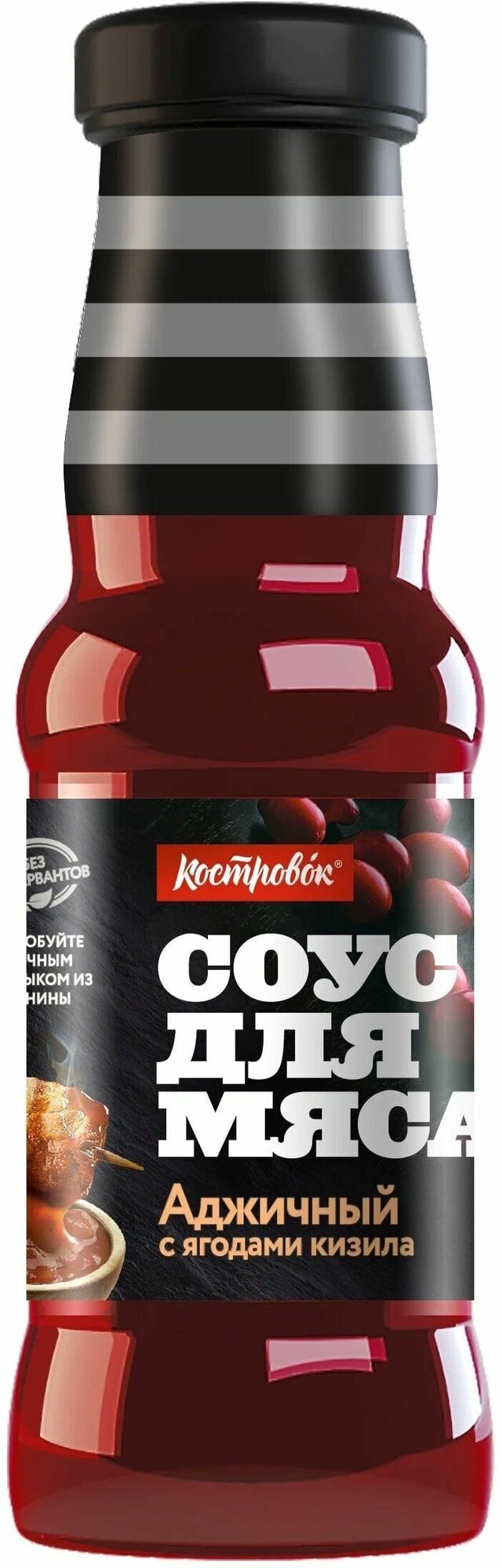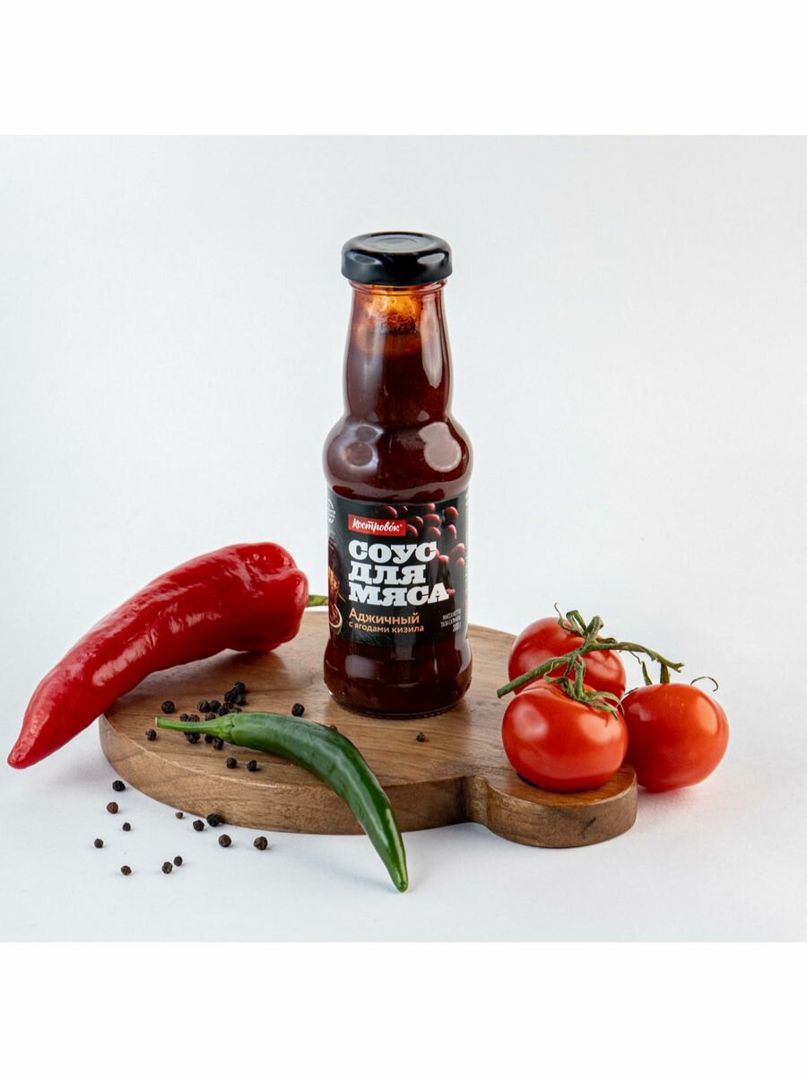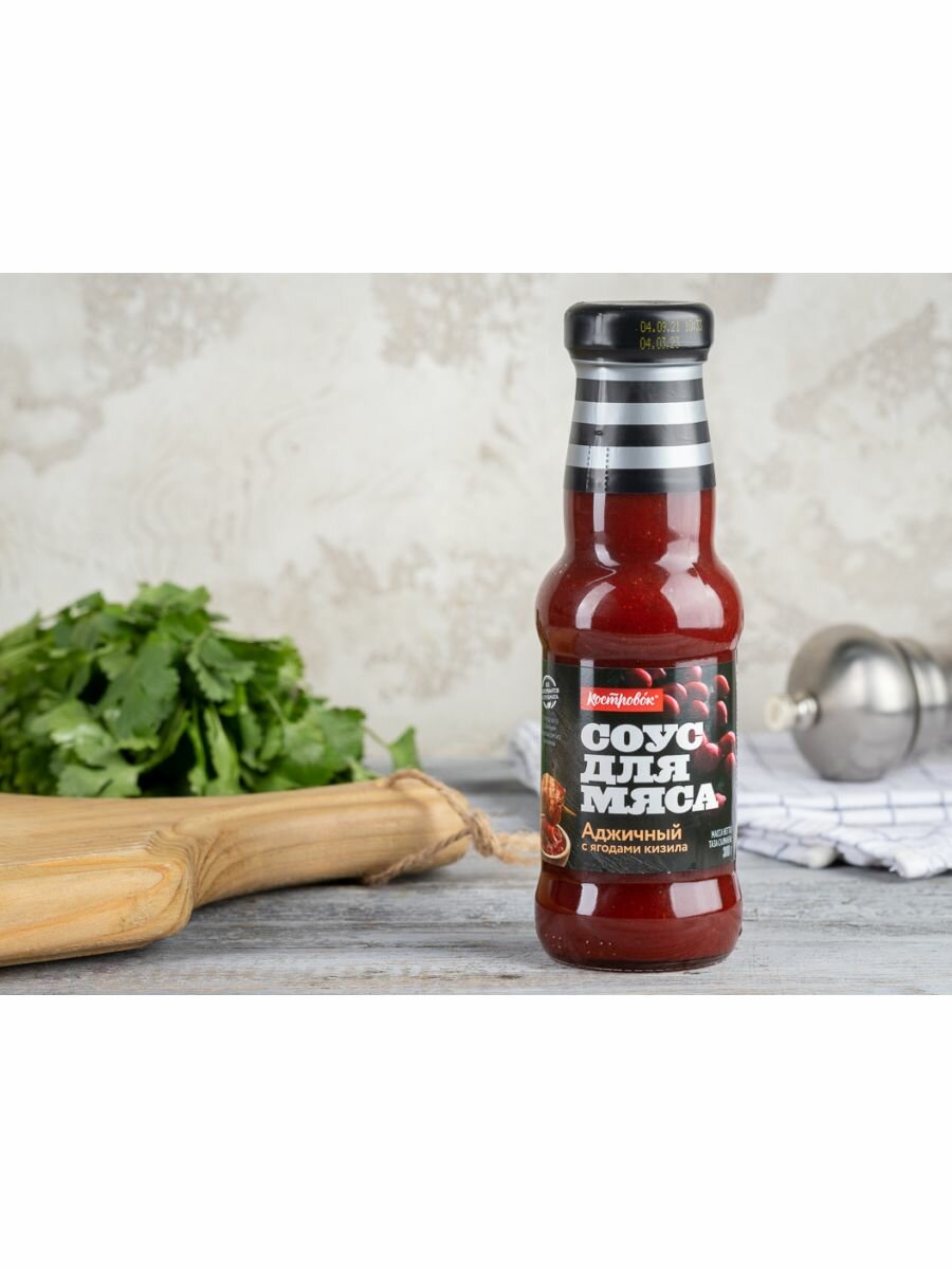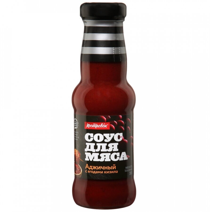 Продуктовая компания «Костровок» предлагает вам необычный соус, который обязательно украсит ваш пикник или домашний мясной стол. «Аджичный на кизиле» содержит в составе патоку, готовый острый аджичный соус с красным перцем и чесноком, виноградный и вишневый соки, паприку, лук, ароматные кориандр и пажитник и одну особенность — пюре из ягод кизила. Этот пикантный продукт можно использовать как добавление к готовому мясу, а также как острую приправу к свежим овощным салатам.