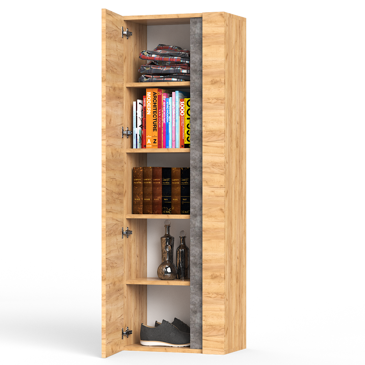 Шкаф комбинированный 10.05. Цвет - дуб крафт золотой/камень тёмный. Размер (ШхГхВ) 50х30х155 (148) см. Высокий узкий шкаф станет ярким мебельным акцентом в интерьере гостиной. За распашной дверкой шкафа расположены четыре полочки. Дверка открывается за край фасада. Шкаф можно использовать как самостоятельную мебельную единицу или в составе мебельной композиции.