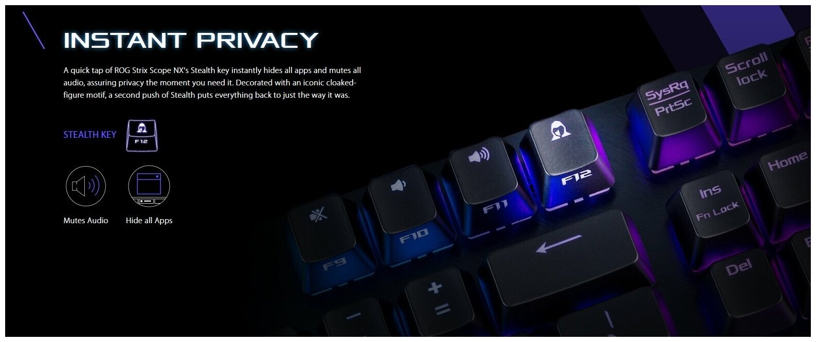 Механическая проводная игровая клавиатура ROG Strix Scope NX: переключатели ROG NX, алюминиевая рама, синхронизируемая подсветка Aura и серебристые шляпки для клавиш WASD. ROG Strix Scope NX – это механическая клавиатура, оптимизированная под шутеры от первого лица. Она оснащается красочной полноцветной подсветкой Aura, синхронизируемой с другими Aura-совместимыми устройствами, обладает специальной клавишей «стелс» и позволяет моментально переключаться между двумя режимами работы верхнего ряда клавиш. Долговечная алюминиевая накладка на верхней панели корпуса добавляет стиля ее дизайну. Вперед к победе – с клавиатурой ROG Strix Scope NX!