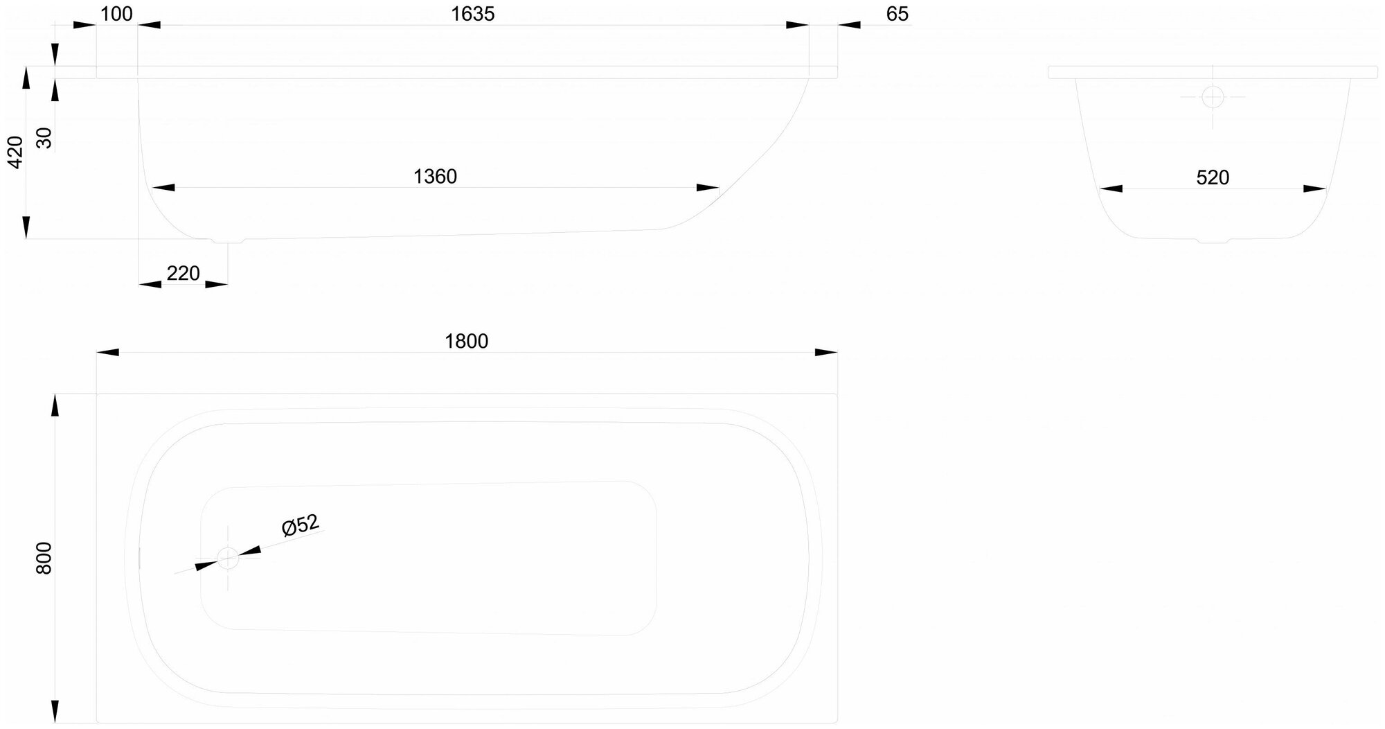 - Диаметр слива 52 мм.