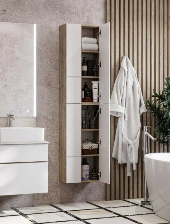 Шкаф двустворчатый АКВАТОН Мишель дуб рустикальный, фьорд - отличный выбор для ванной комнаты. При желании из двух шкафчиков можно составить вместительную шкаф-колонну. Все фасады оснащены системой открывания push-to-open. Дизайн шкафчика повторяет тумбу-умывальник: фасады в матовой пленке фьерд сочетаются с корпусом в декоре дуб рустикальный. Указанные размеры смогут создать уют и удобное расположение, благодаря современному стилю легко вписывается в любой интерьер. Вся продукция от производителя Акватон не требует особого ухода, легко очищается от загрязнений