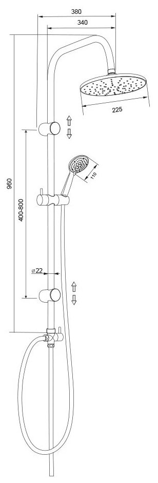 В комплекте поставки: душевая лейка, верхний душ, штанга для душа, шланг для душа.