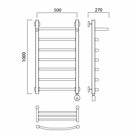 Электрический полотенцесушитель Акванерж дуга с полкой 1000x500 левыйПредназначен для сушки тканевых изделий, обогрева ванных и душевых комнат и поддержания нормального микроклимата в ванной комнате. Температура в рабочем режиме 55С +-10, регулируется терморегулятором от 30С до 70С. Двойная система предохранения, автоматическое отключение и включение прибора для экономии электроэнергии. От перегревания ограничитель температуры отключает нагревательный элемент. Средняя потребляемая мощность 100 - 150W. Абсолютно безопасен, не требует заземления. Материал изделия: Бесшовная труба из нержавеющий стали Sanha made in Germany (AISI 304) - толщина стенок не менее 2.2 мм Диаметр основных стоек: 32 мм Диаметр поперечных перекладин: 18 мм Электрополотенцесушитель низкого энергопотребления от 100 до 150W в рабочем режиме Модель «умеет» отключаться самостоятельно при определенном (выставленном) уровне температуры. Гарантия на изделия 5 лет и 25 лет срок эксплуатации Гарантия на терморегулятор 1 год Возможно изготовление изделия на заказ (по эскизам заказчика)