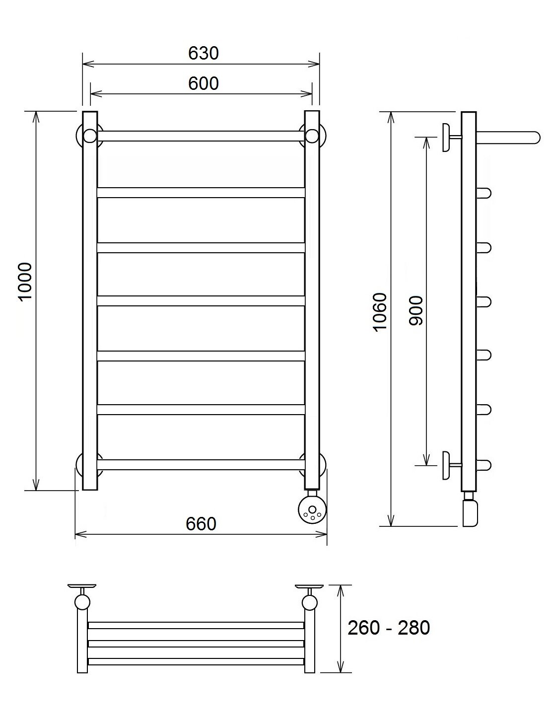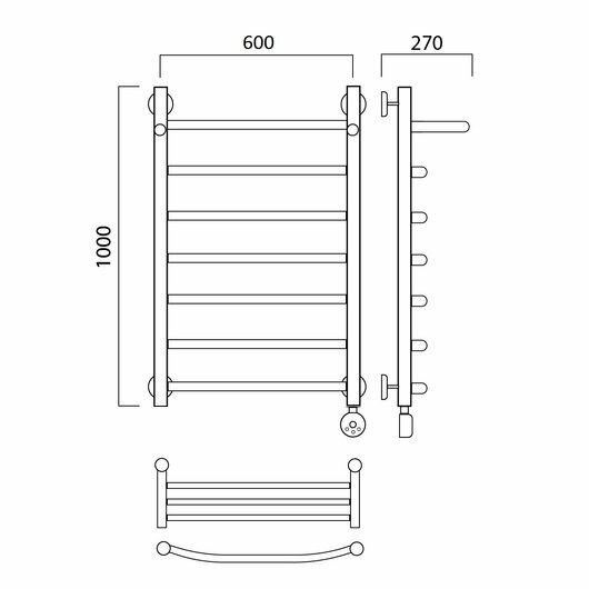 Электрический полотенцесушитель Акванерж дуга с полкой 1000x600 левыйПредназначен для сушки тканевых изделий, обогрева ванных и душевых комнат и поддержания нормального микроклимата в ванной комнате. Температура в рабочем режиме 55С +-10, регулируется терморегулятором от 30С до 70С. Двойная система предохранения, автоматическое отключение и включение прибора для экономии электроэнергии. От перегревания ограничитель температуры отключает нагревательный элемент. Средняя потребляемая мощность 100 - 150W. Абсолютно безопасен, не требует заземления. Материал изделия: Бесшовная труба из нержавеющий стали Sanha made in Germany (AISI 304) - толщина стенок не менее 2.2 мм Диаметр основных стоек: 32 мм Диаметр поперечных перекладин: 18 мм Электрополотенцесушитель низкого энергопотребления от 100 до 150W в рабочем режиме Модель «умеет» отключаться самостоятельно при определенном (выставленном) уровне температуры. Гарантия на изделия 5 лет и 25 лет срок эксплуатации Гарантия на терморегулятор 1 год Возможно изготовление изделия на заказ (по эскизам заказчика)