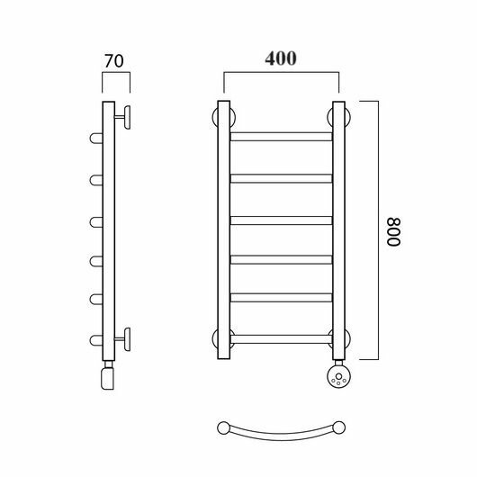 Электрический полотенцесушитель Акванерж дуга 800x400 левый (также бывает и в правом исполнении)Предназначен для сушки тканевых изделий, обогрева ванных и душевых комнат и поддержания нормального микроклимата в ванной комнате. Температура в рабочем режиме 55С +-10, регулируется терморегулятором от 30С до 70С. Двойная система предохранения, автоматическое отключение и включение прибора для экономии электроэнергии. От перегревания ограничитель температуры отключает нагревательный элемент. Средняя потребляемая мощность 100 - 150W. Абсолютно безопасен, не требует заземления. Материал изделия: Бесшовная труба из нержавеющий стали Sanha made in Germany (AISI 304) - толщина стенок не менее 2.2 мм Диаметр основных стоек: 32 мм Диаметр поперечных перекладин: 18 мм Электрополотенцесушитель низкого энергопотребления от 100 до 150W в рабочем режиме Модель «умеет» отключаться самостоятельно при определенном (выставленном) уровне температуры. Гарантия на изделия 5 лет и 25 лет срок эксплуатации Гарантия на терморегулятор 1 год Возможно изготовление изделия на заказ (по эскизам заказчика)