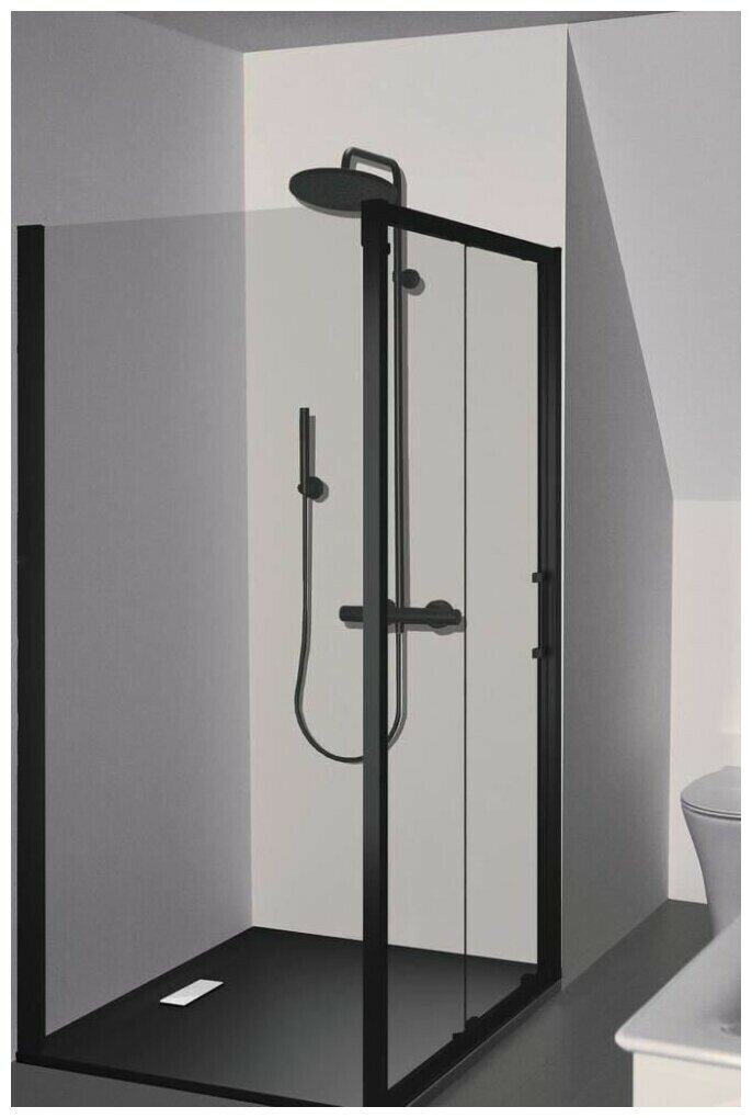 Душевая стойка. Цвет: черный матовый. Режимов на верхнем душе: 1. Тип переключателя: термостатический катридж. Материал лейки: металл. Материал шланга: пластик. Отверстие для монтажа: на четыре отверстия.