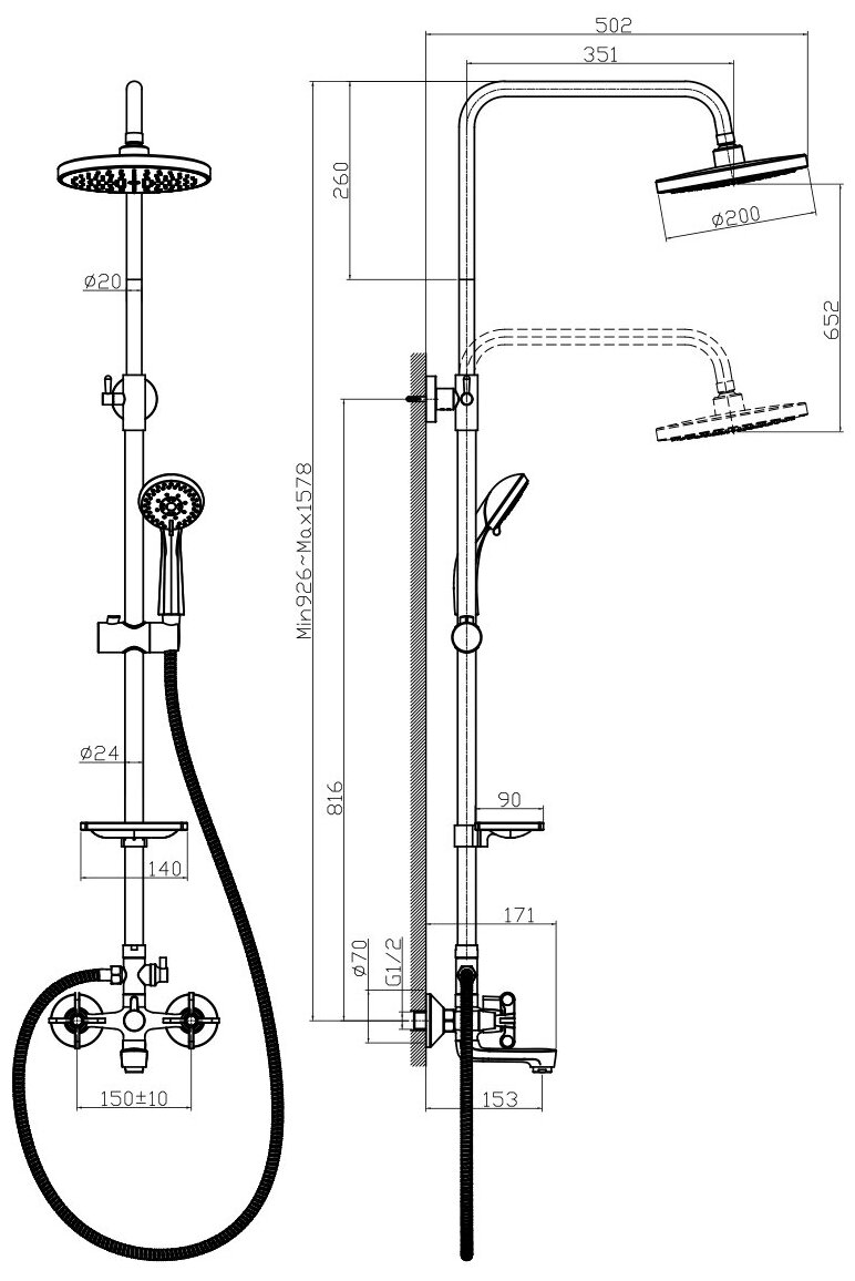 | Вынос верхнего душа от стены | 502 |