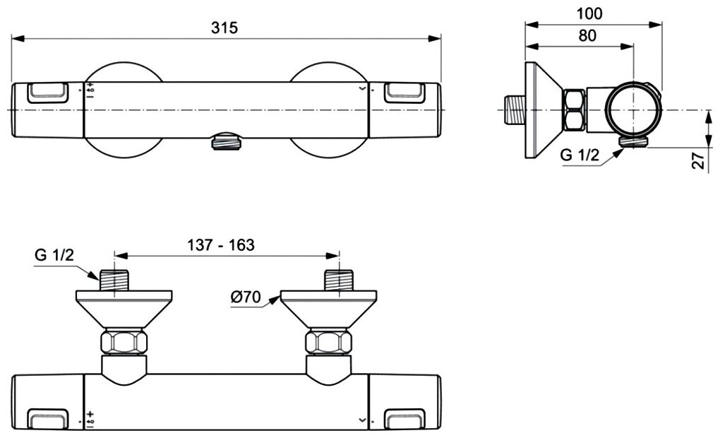 | Дополнительная информация | Настенный термостатический смеситель для душа, монтаж на стандартных эксцентриках, термостатический картридж IS, новая технология, затворы на керамических дисках G1/2 180?, технология "Cool body" ("Холодный корпус"), пластиковые рукоятки с ограничителями температуры (40?C) и потока воды (50%), встроенный обратный клапан. |