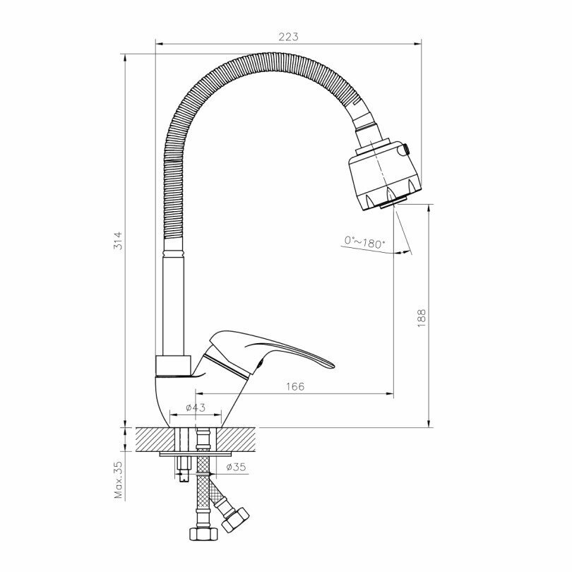 Смеситель одноручный (35мм) для кухни с гибким изливом, хром, A35-26