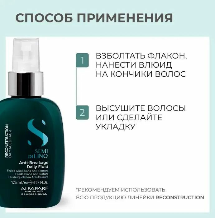 | Применение | после процедуры мытья головы равномерно распылить флюид на влажные, отжатые полотенцем волосы. Не смывать |