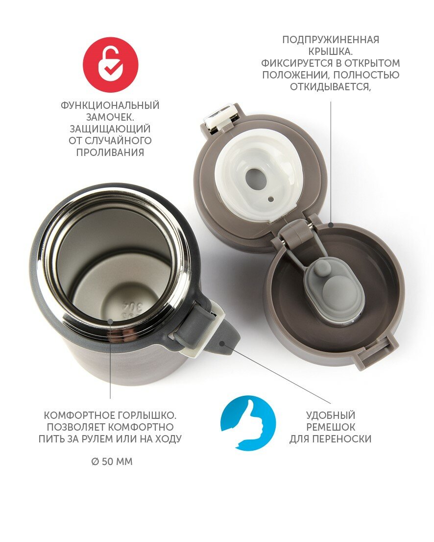 Комфортное горлышко позволяет спокойно пить за рулем или на ходу. Подпружиненная крышка фиксируется в открытом положении, откидывается, а также имеет функциональный замочек, защищающий от случайного открытия.