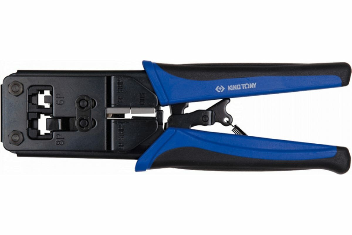 Ручной кримпер модульный для шести/восьми жильных разъемов KING TONY предназначен для удаления изоляции с круглых кабелей, плоских неэкранированных телефонных кабелей, а также опрессовки полюсных штекеров. В конструкции обжимника предусмотрен продольный резак и нож для удаления оболочки. Усилие резания инструмента увеличено за счет рычажной передачи, что сокращает энергозатраты при работе.