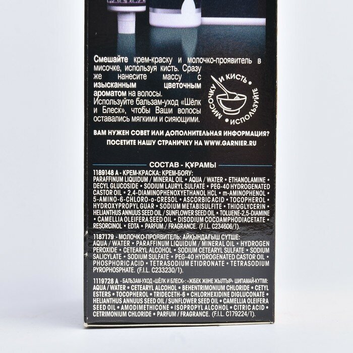 | Состав | paraffinum liquidum/mineral oil, aqua/water, , ethanolamine, decyl glucoside, sodium laurylsulfate, peg-40hydrogenated castor oil, 2,4-diaminophenoxyethanol hcl, m-aminophenol, 5-amino-6-chloro-o-cresol, ascorbic acid, tocopherol, hydroxypropyl guar, soidum metabisulfite, thioglycerin, helianthus annuus seed oil/sunflower seed oil, toluene-2,5-diamine, limnathes alba seed oil/meadowfoam seed oil, camellia oliefera seed oil, disodium cocoamphodiacetate, passifora incarnata/passiflora incarnata seed oil, resorcinol, edta, parfum/fragrance |