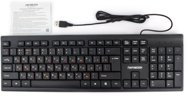 | Дополнительно * | Клавиатура Гарнизон GK-130, USB, черный, 104 кл, кабель 1.5м, Полноразмерная проводная клавиатура, Классическая раскладка, Большой Г-образный Enter, Яркий цвет кириллических символов |