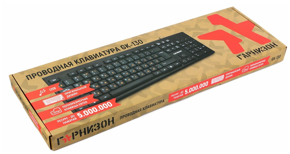 Дополнительно * | Клавиатура Гарнизон GK-130, USB, черный, 104 кл, кабель 1.5м, Полноразмерная проводная клавиатура, Классическая раскладка, Большой Г-образный Enter, Яркий цвет кириллических символов |