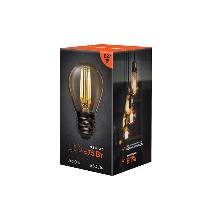 Филаментные недиммируемые лампочки GL45 обошли по своим преимуществам светодиодные источники света и лампы накаливания. Изделия представляют собой стеклянную колбу с газом и нитевидном светодиодом на сапфировом основании. Лампа обеспечивает равномерность теплого белого свечения с температурой 2700 К и световым потоком 950 Лм во всех направлениях и под углом 320 градусов. Золотистая колба в форме шарика с цоколем Е27 позволяет монтировать лампу во многие осветительные приборы - как в открытые, так и в закрытые плафоны. Светодиод мгновенно зажигается, не нагревается, не искажает реальные оттенки предметов: рассчитан на долговечную службу - 30000 ч. Мощность лампочки 9, 5 Вт аналогичная мощности лампы накаливания 75 Вт. Лампа обладает минимальным энергопотреблением, насыщенностью свечения, упрощенной утилизацией, эффективным отведением тепла. Лампу можно устанавливать возле натяжных и гипсокартонных потолков. Изделие можно отнести к одному из лучших достижений LED-технологий.
