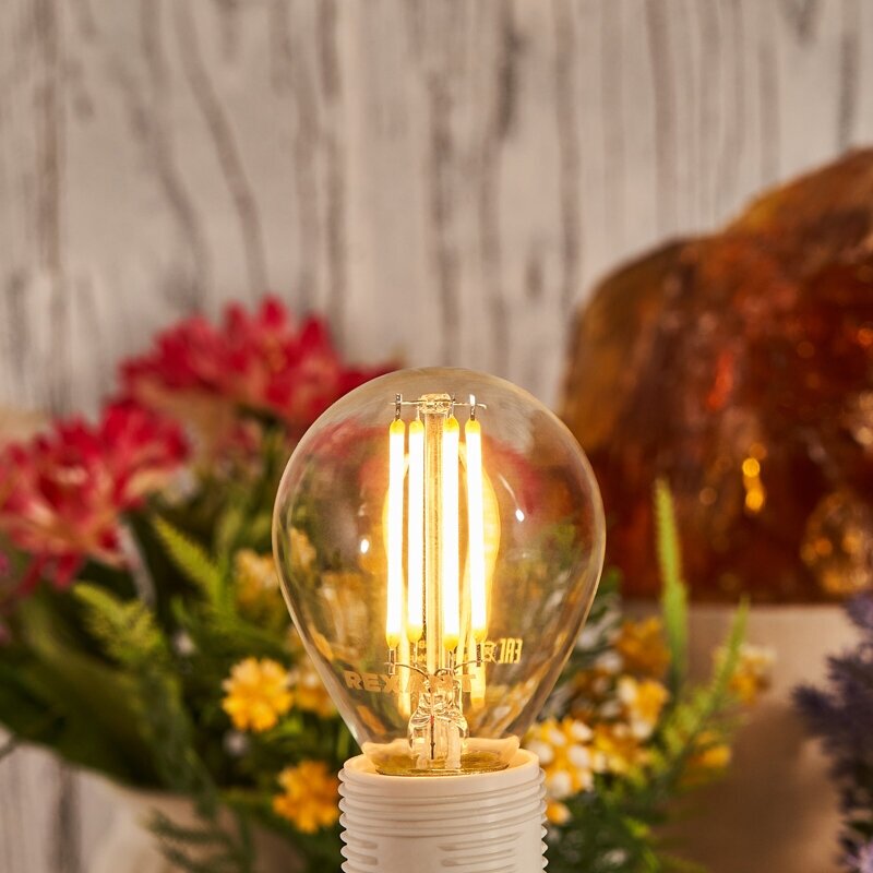 Филаментные недиммируемые лампочки GL45 обошли по своим преимуществам светодиодные источники света и лампы накаливания. Изделия представляют собой стеклянную колбу с газом и нитевидном светодиодом на сапфировом основании. Лампа обеспечивает равномерность теплого белого свечения с температурой 2700 К и световым потоком 600 Лм во всех направлениях и под углом 320 градусов. Прозрачная колба в форме шарика с цоколем Е14 позволяет монтировать лампу во многие осветительные приборы - как в открытые, так и в закрытые плафоны. Светодиод мгновенно зажигается, не нагревается, не искажает реальные оттенки предметов: рассчитан на долговечную службу - 30000 ч. Мощность лампочки 7, 5 Вт аналогичная мощности лампы накаливания 60 Вт. Лампа обладает минимальным энергопотреблением, насыщенностью свечения, упрощенной утилизацией, эффективным отведением тепла. Лампу можно устанавливать возле натяжных и гипсокартонных потолков. Изделие можно отнести к одному из лучших достижений LED-технологий.