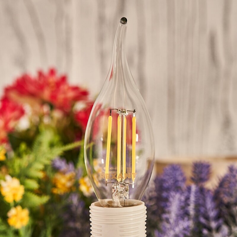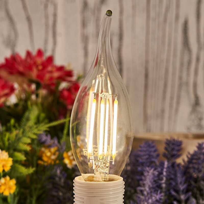 Филаментные диммируемые лампочки CN37 обошли по своим преимуществам светодиодные источники света и лампы накаливания. Изделия представляют собой стеклянную колбу с газом и нитевидном светодиодом на сапфировом основании. Лампа обеспечивает равномерность нейтрального белого свечения с температурой 4000 К и световым потоком 600 Лм во всех направлениях и под углом 320 градусов. Прозрачная колба в форме свечи на ветру с цоколем Е14 позволяет монтировать лампу во многие осветительные приборы - как в открытые, так и в закрытые плафоны. Светодиод мгновенно зажигается, не нагревается, не искажает реальные оттенки предметов: рассчитан на долговечную службу - 30000 часов. Мощность лампочки 7, 5 Вт аналогичная мощности лампы накаливания 60 Вт. Лампа обладает минимальным энергопотреблением, насыщенностью свечения, упрощенной утилизацией, эффективным отведением тепла. Лампу можно устанавливать возле натяжных и гипсокартонных потолков. Изделие можно отнести к одному из лучших достижений LED-технологий.